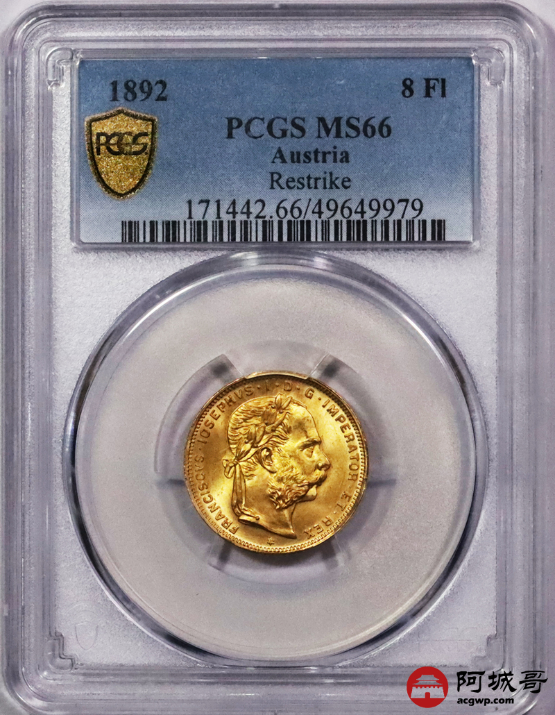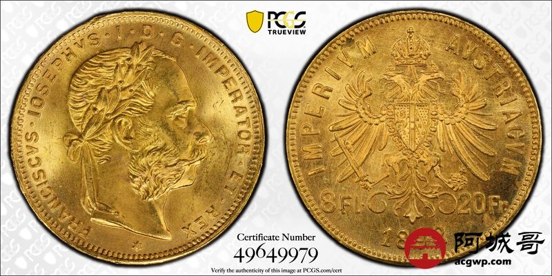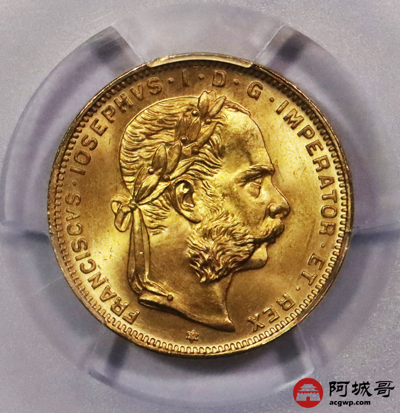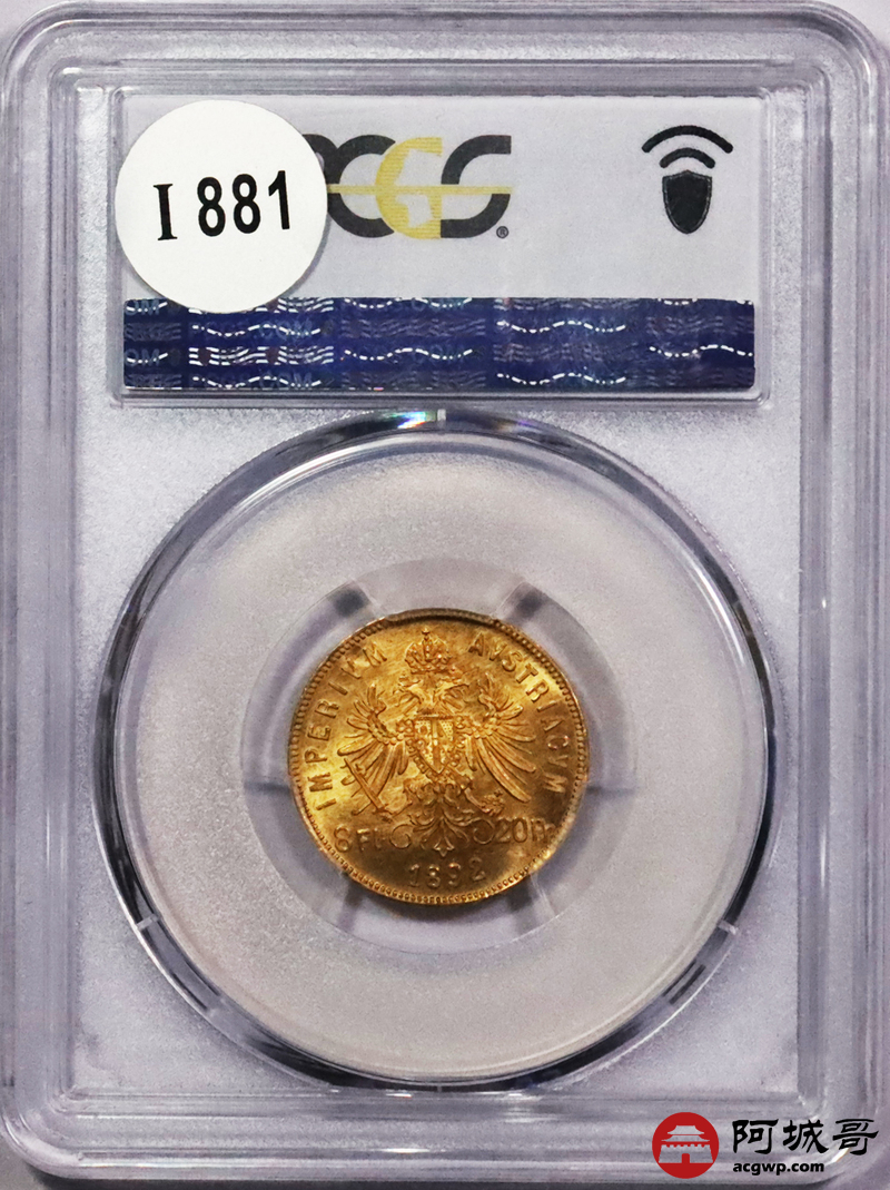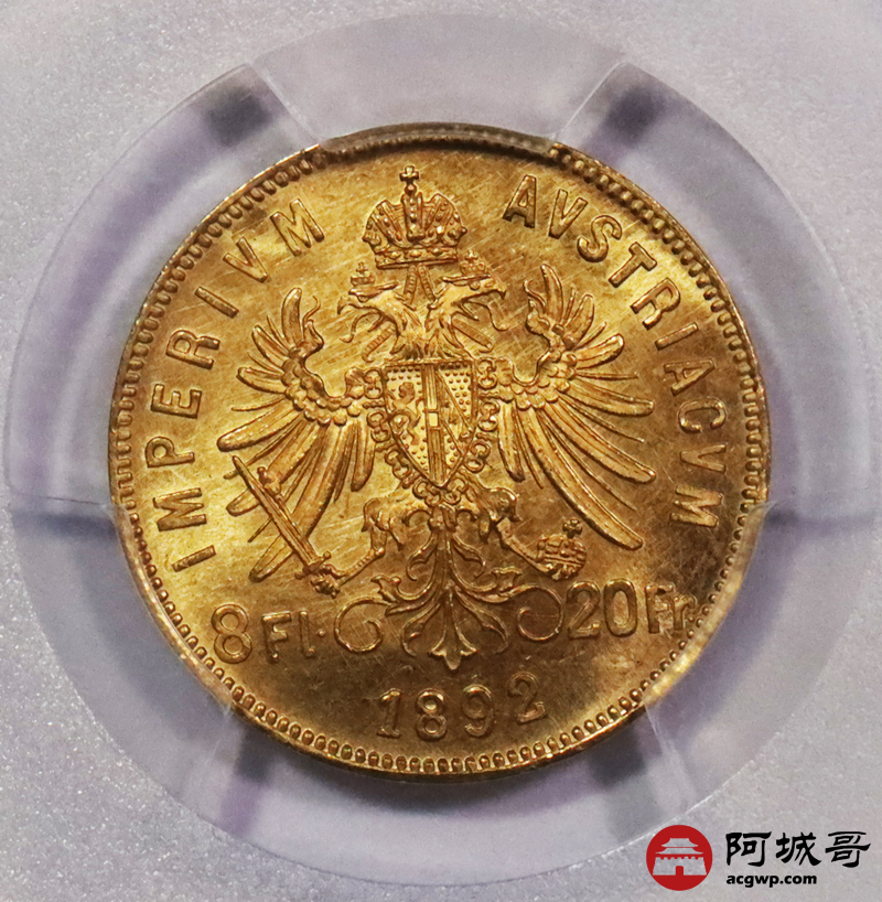 Lot:26 1892年奥匈帝国8佛罗林20法郎金币 PCGS MS66