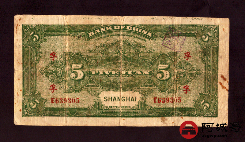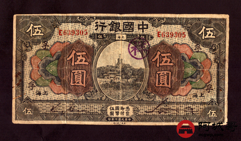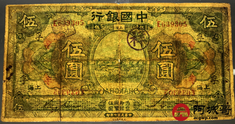 Lot:39 民国七年 中国银行 上海地名 伍圆 69成新