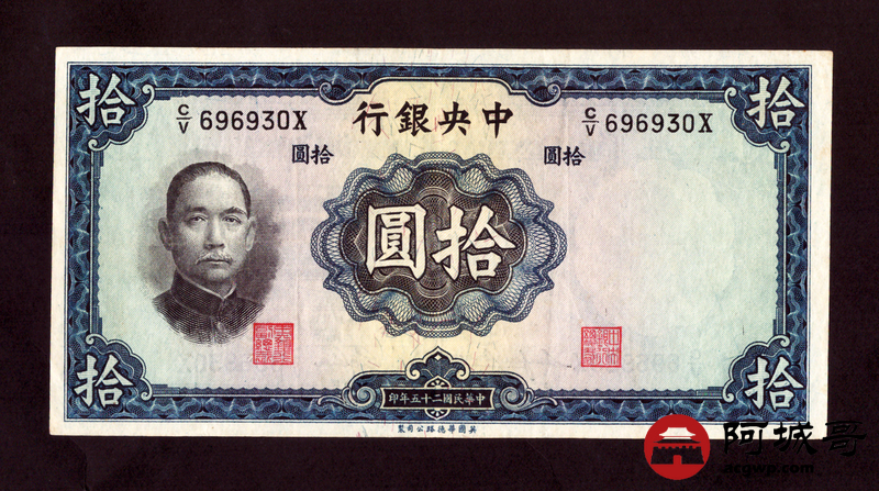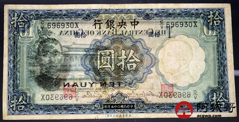Lot:16 民国二十五年 中央银行 拾圆 8成新