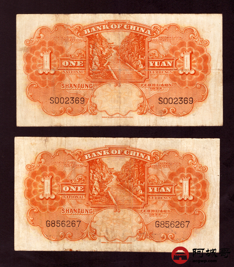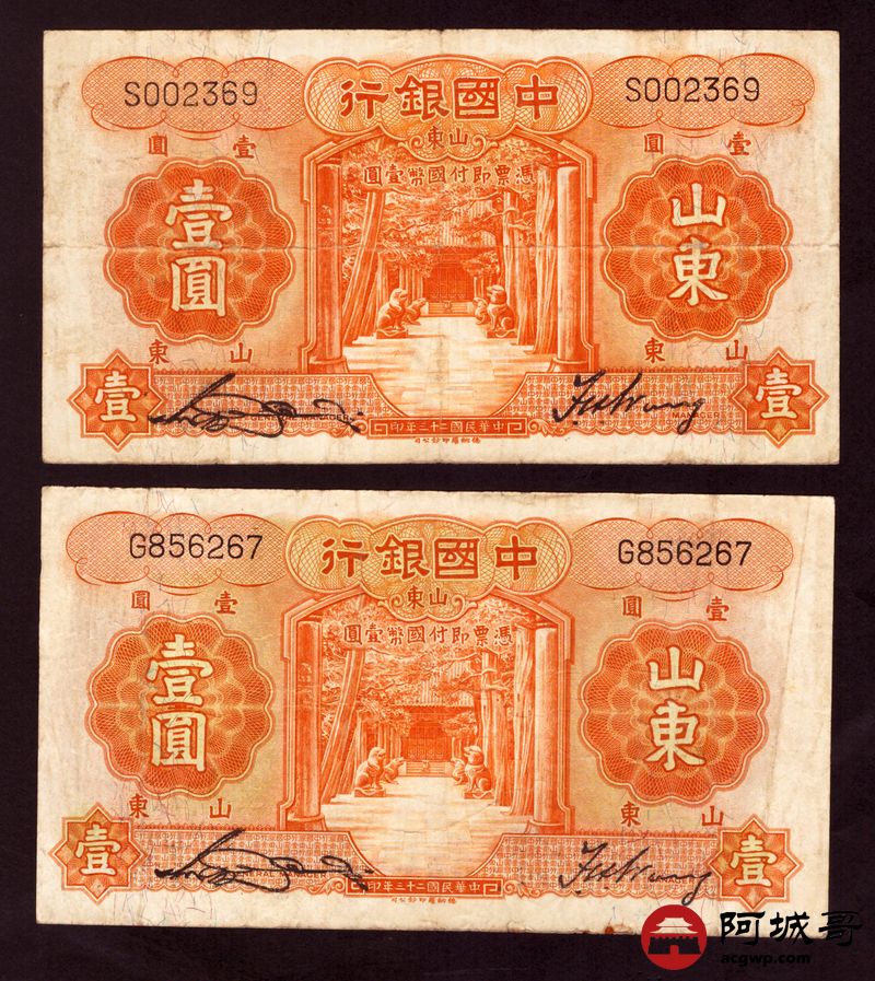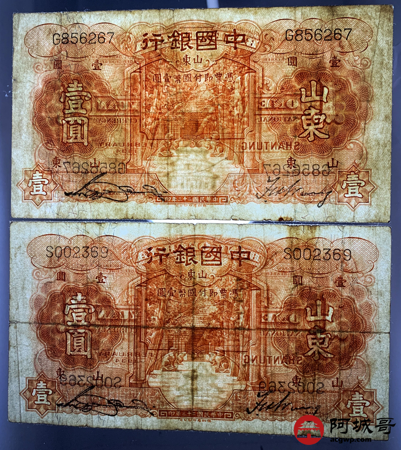 Lot:73 民国二十三年 中国银行 山东 壹圆 2张 69至7成新