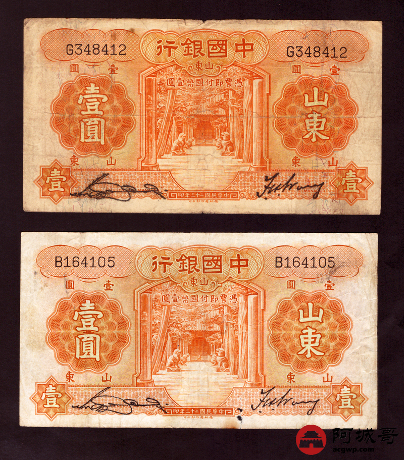 Lot:59 民国二十三年 中国银行 山东地名 壹圆4张 68至69成新