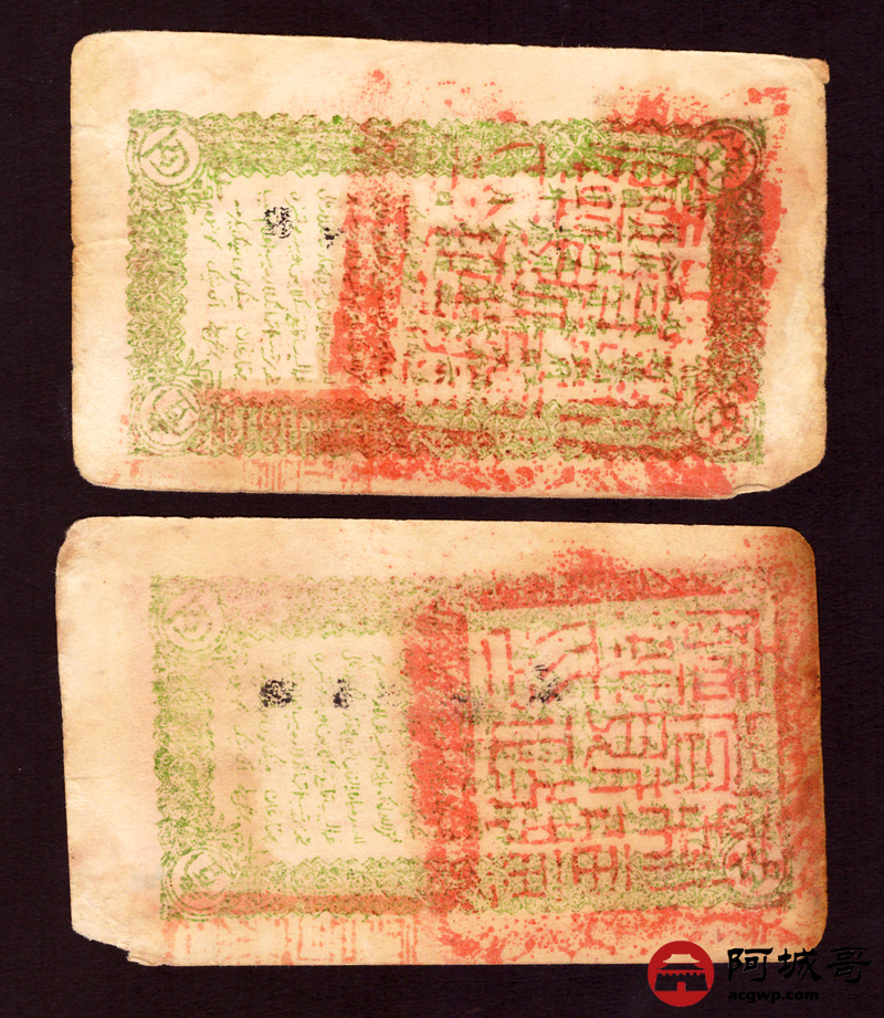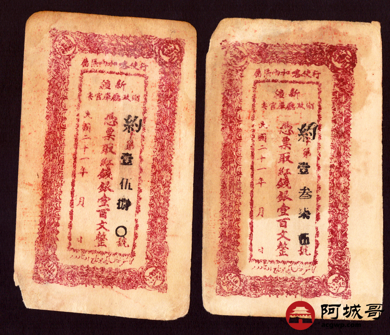 Lot:19 民国21年 新疆财政厅库官票一佰文 两张一组 67至68成新
