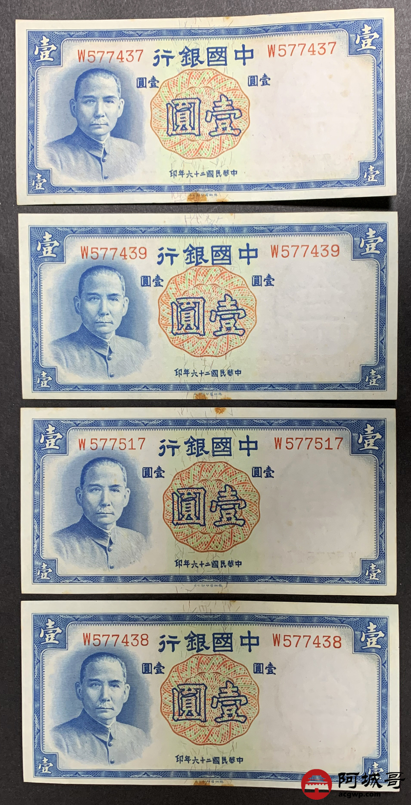 Lot:4 民国二十六年 中国银行壹圆 10张 板子硬8至85成新