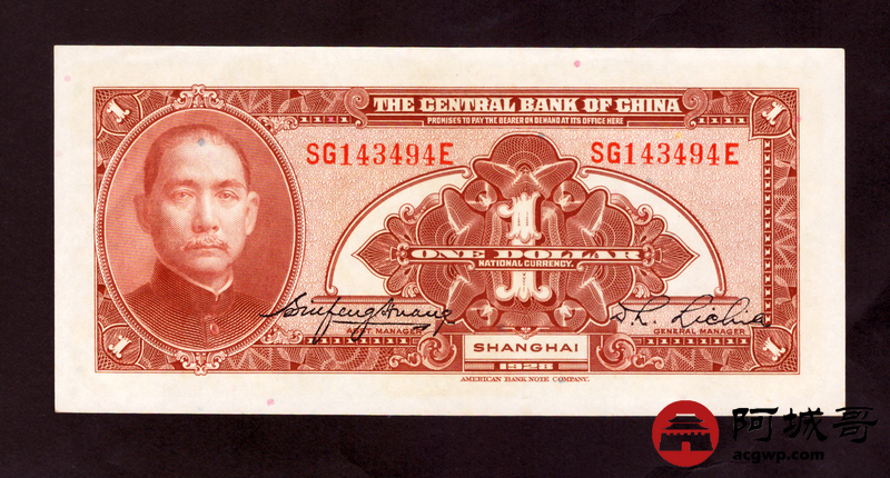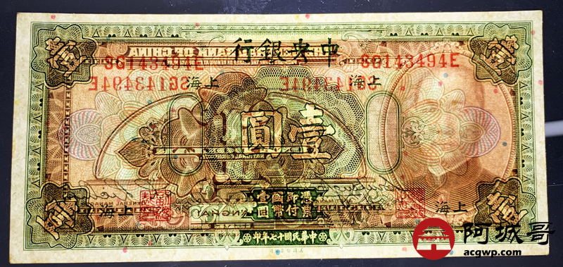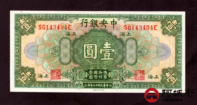 Lot:13 民国十七年 中央银行 壹圆 原票93成新