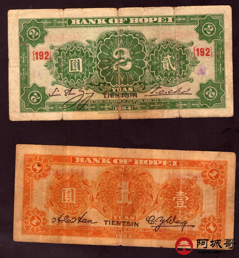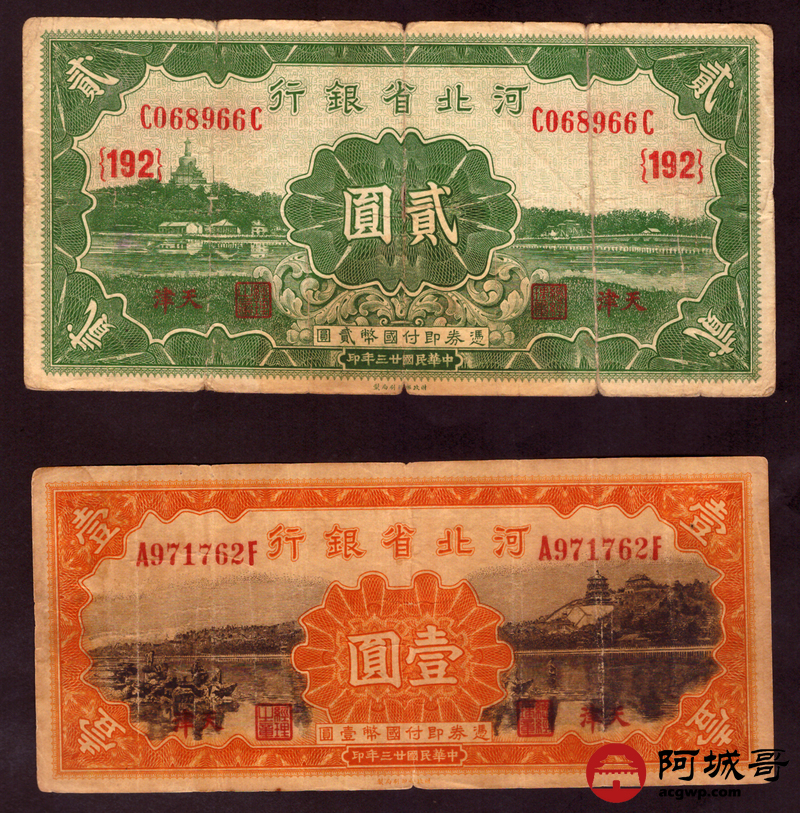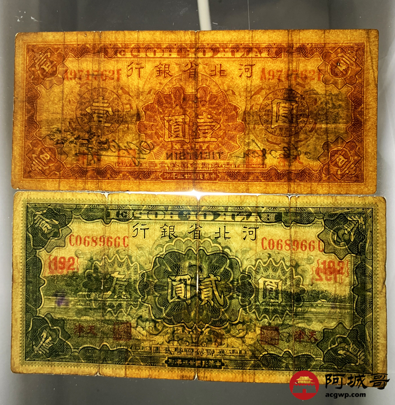 Lot:55 民国23年 河北省银行 贰元 壹元 2张 67至68成新