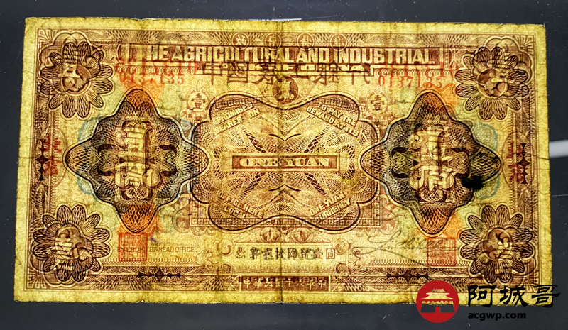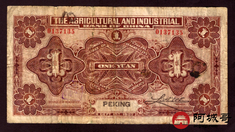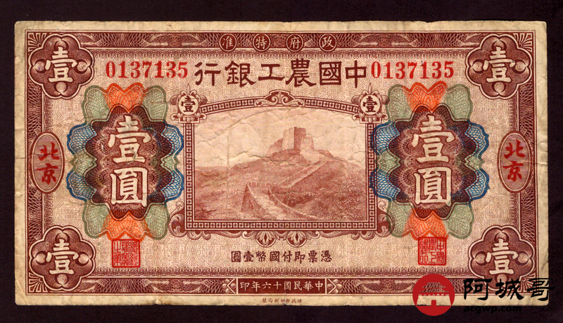 Lot:47 民国十六年 中国农工银行 北京地名 壹圆 69成新 中间有裂