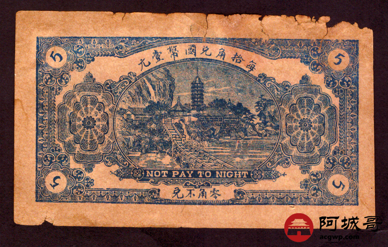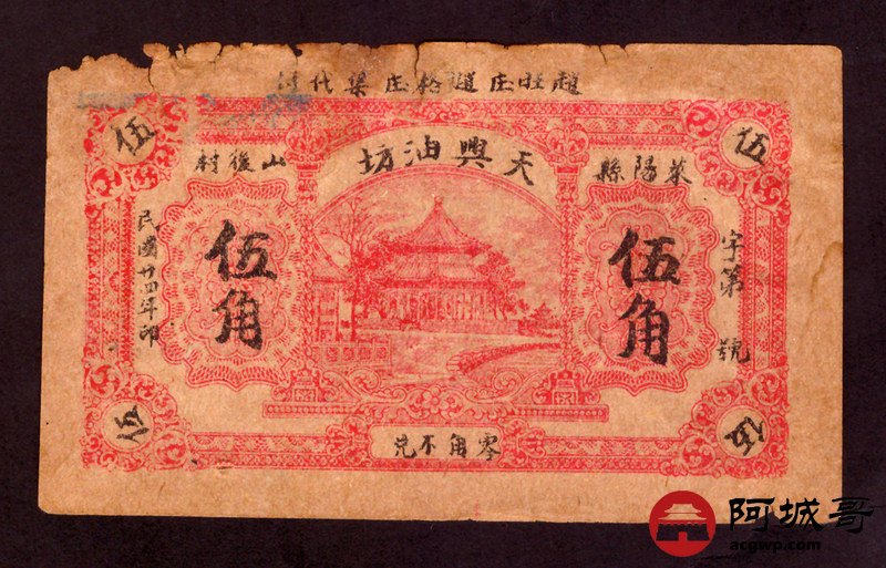 Lot:32 民国二十四年 莱阳县天兴油坊伍角 6成新