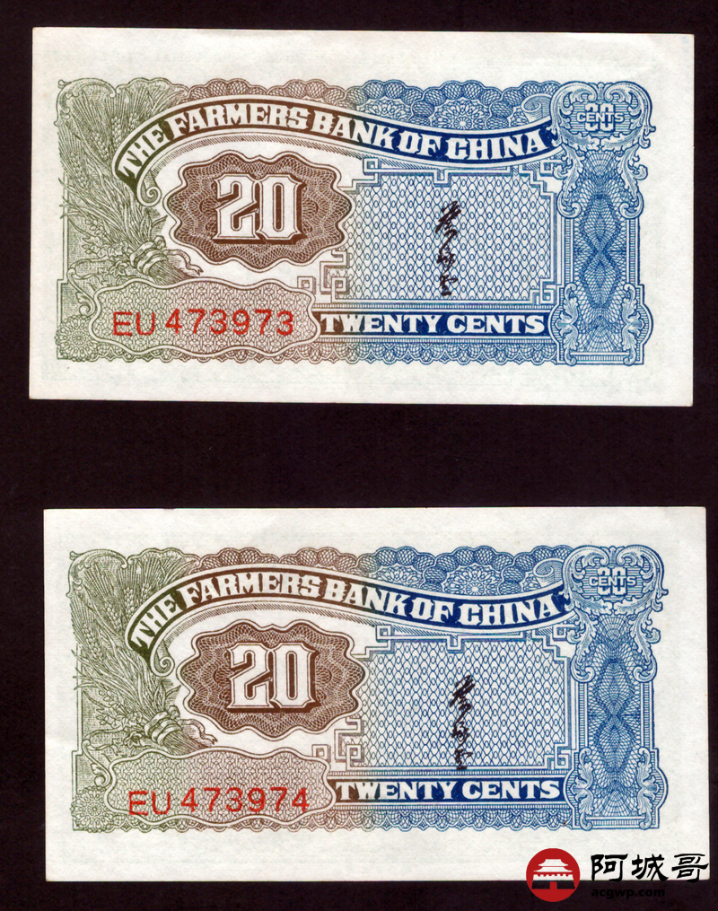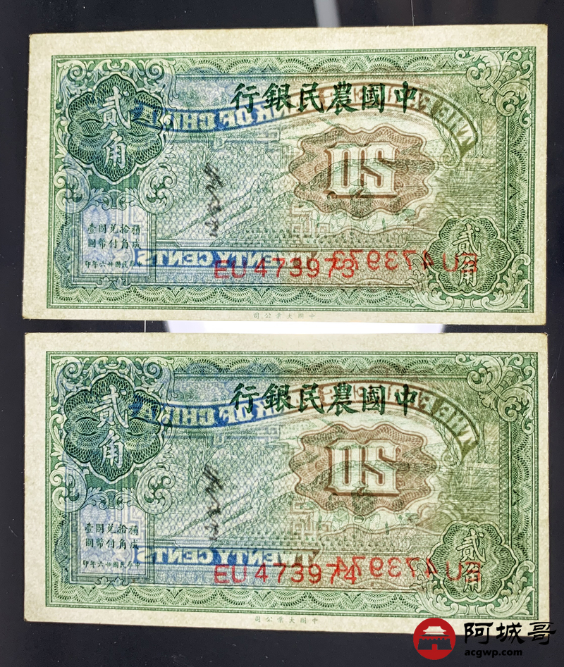 Lot:48 民国26年 中国农民银行 贰角 2张连号 9至92成新