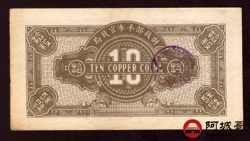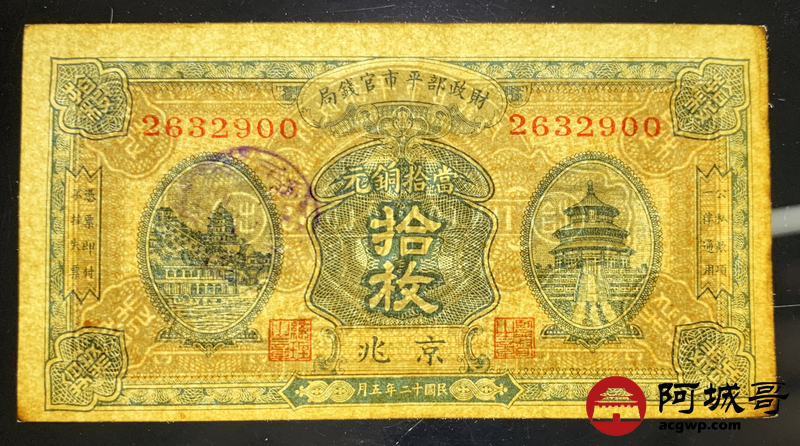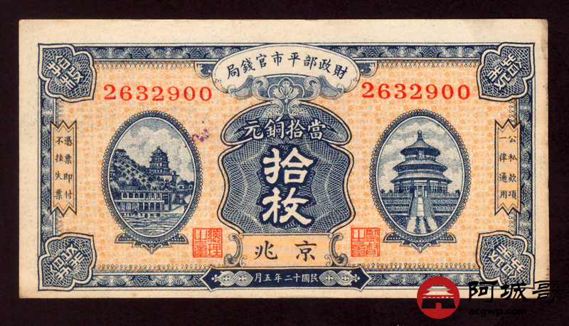 Lot:10 民国十二年 财政部平市官钱局 拾枚 8成新