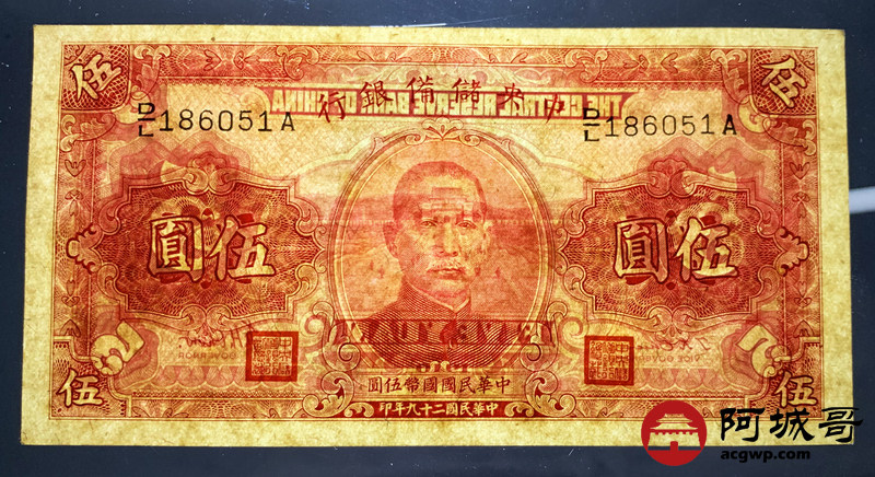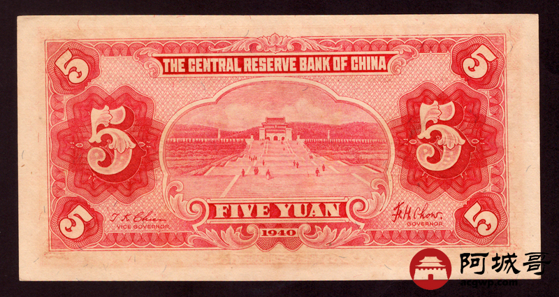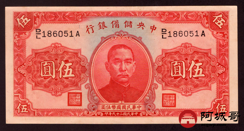 Lot:56 民国29年 中央储备银行 伍圆 93成新