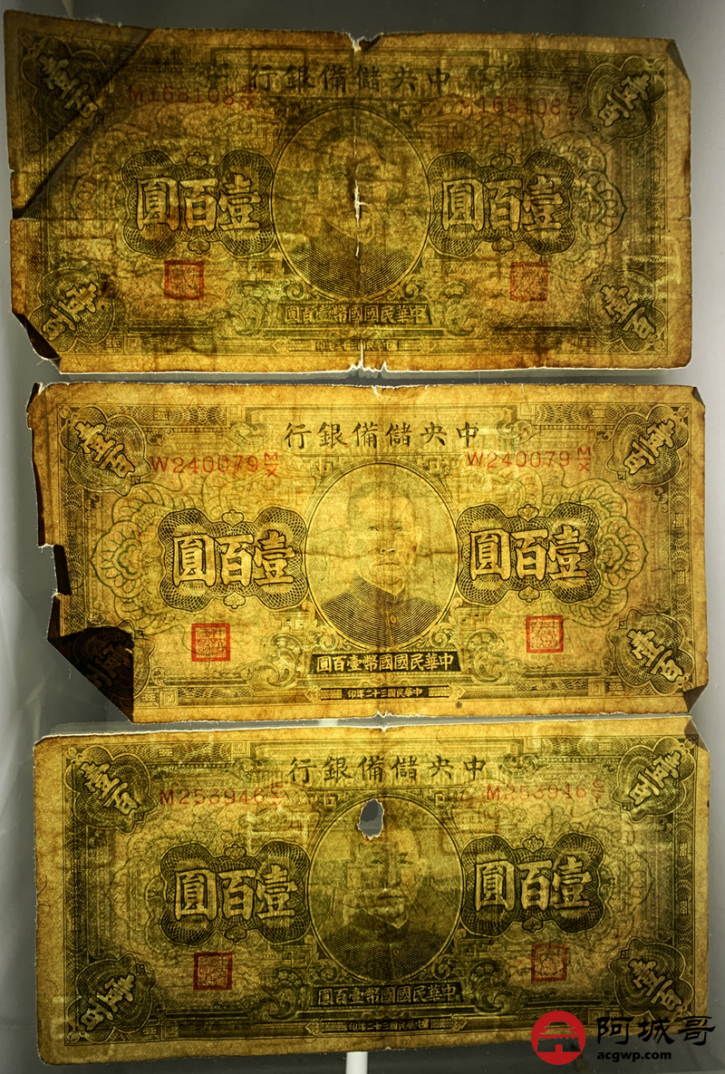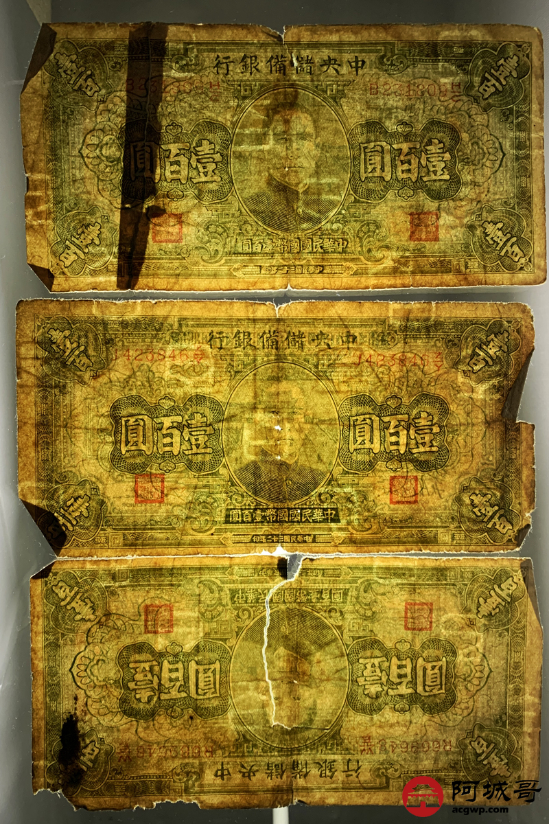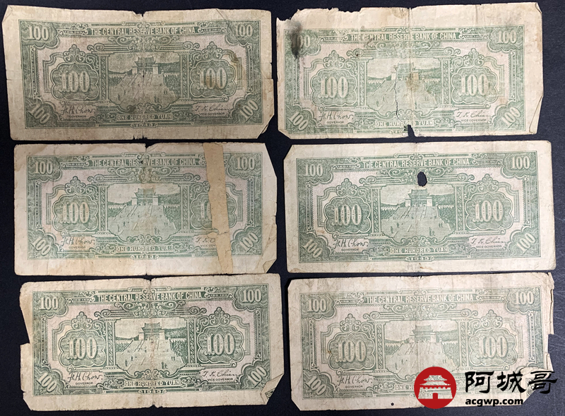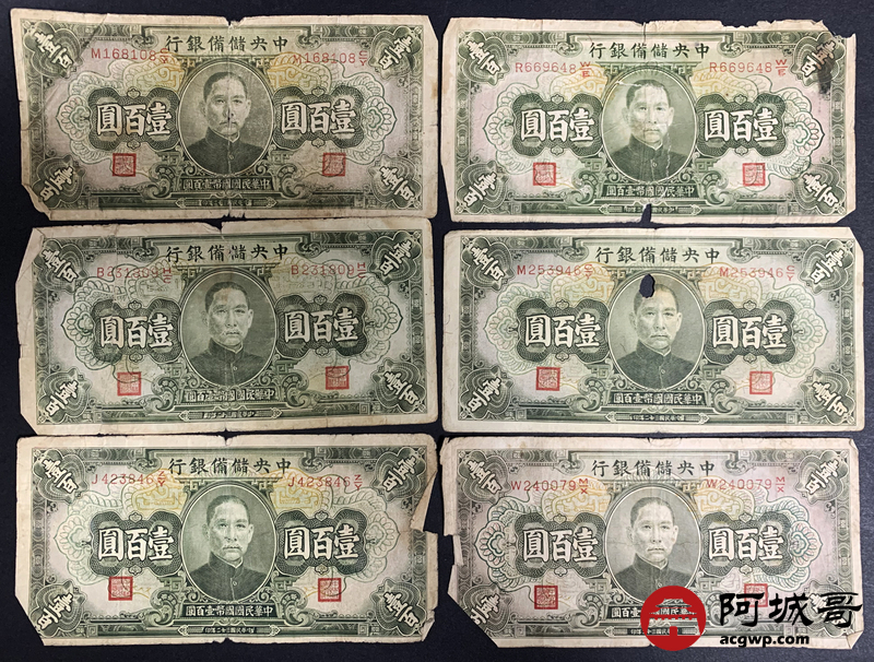 Lot:37 民国三十二年 中央储备银行 壹佰圆 6张 6至68成新 一张修补
