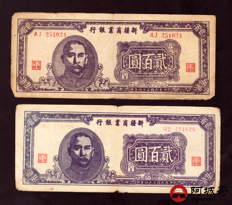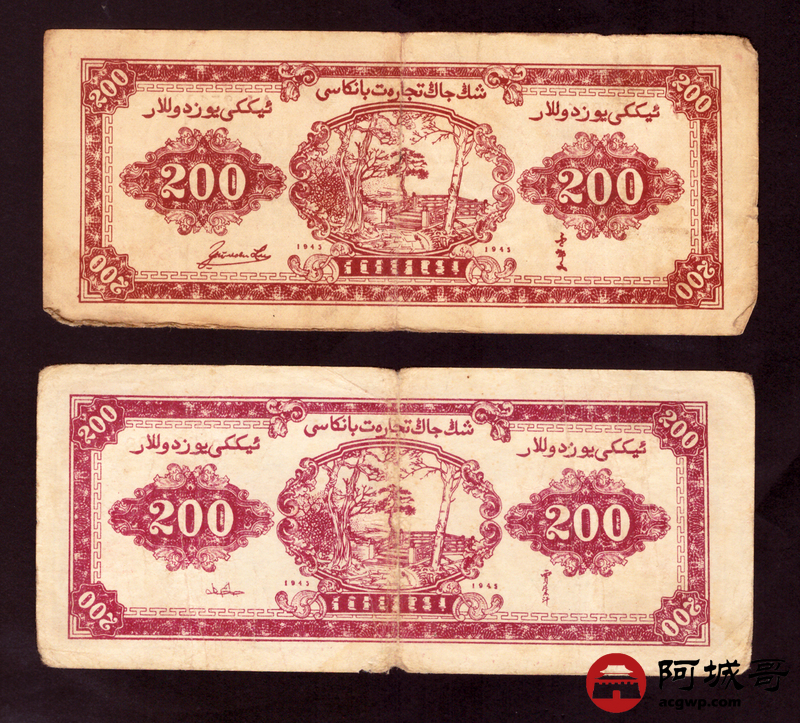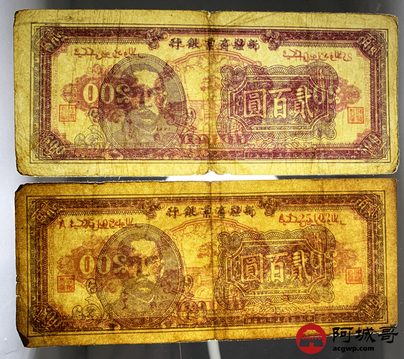 Lot:1 民国三十四年 新疆商业银行 贰佰圆 2张 68至69成新
