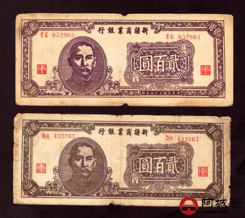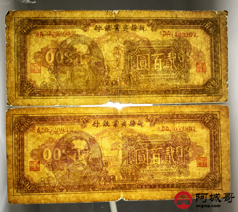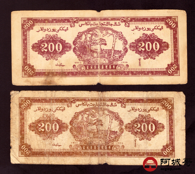 Lot:38 民国三十四年 新疆商业银行 贰佰圆 2张 67成新