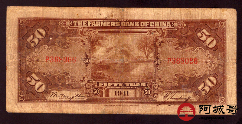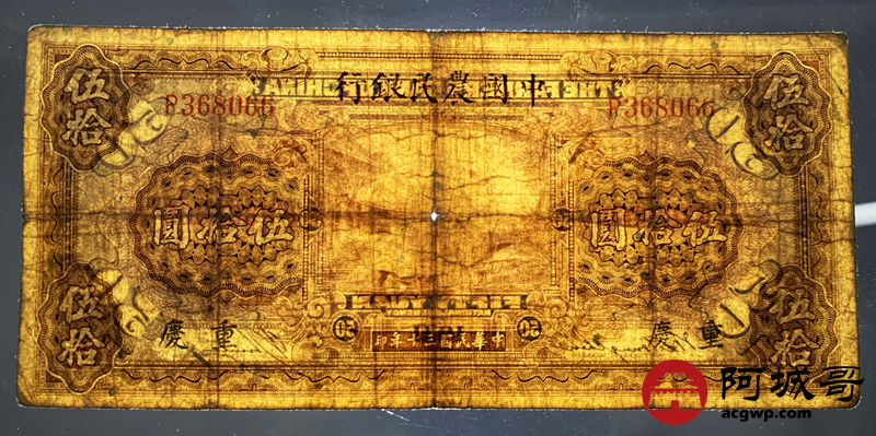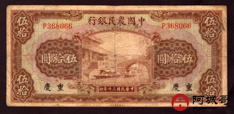 Lot:52 民国三十年 中国农民银行 伍拾圆 重庆地名 69成新