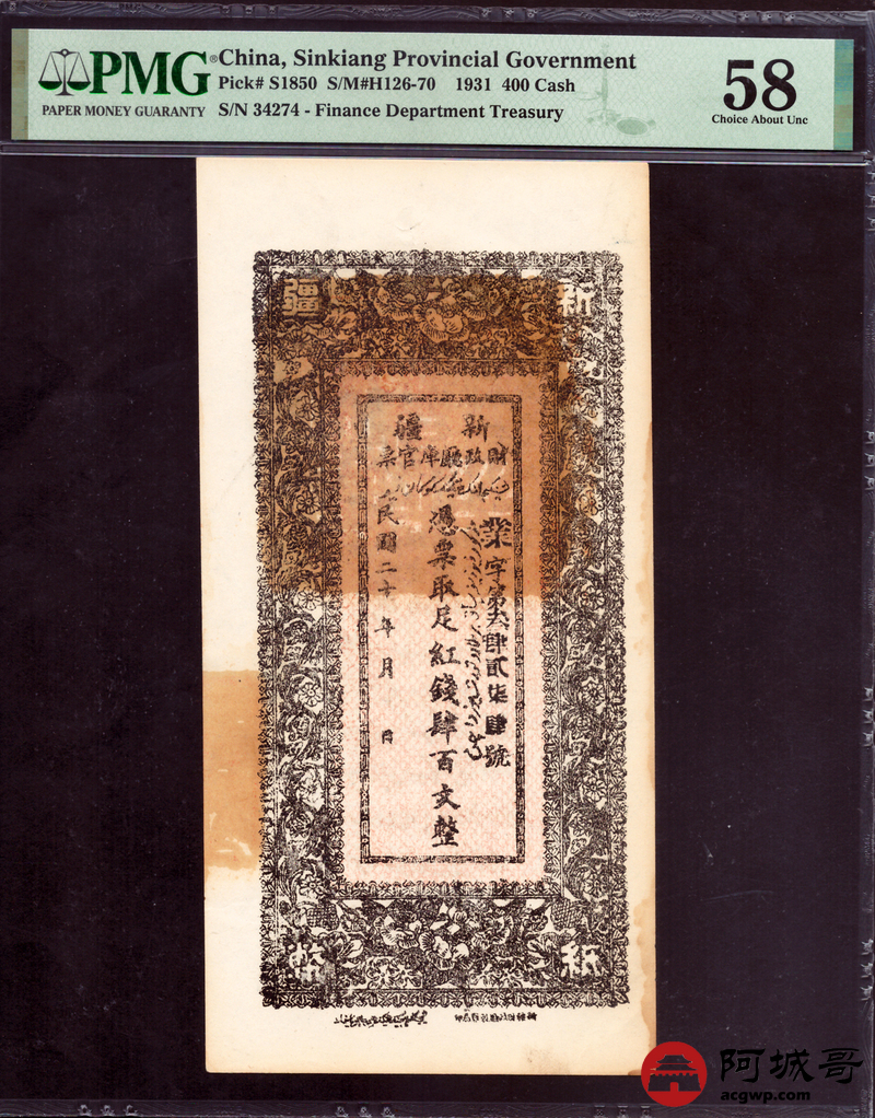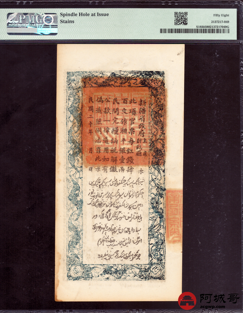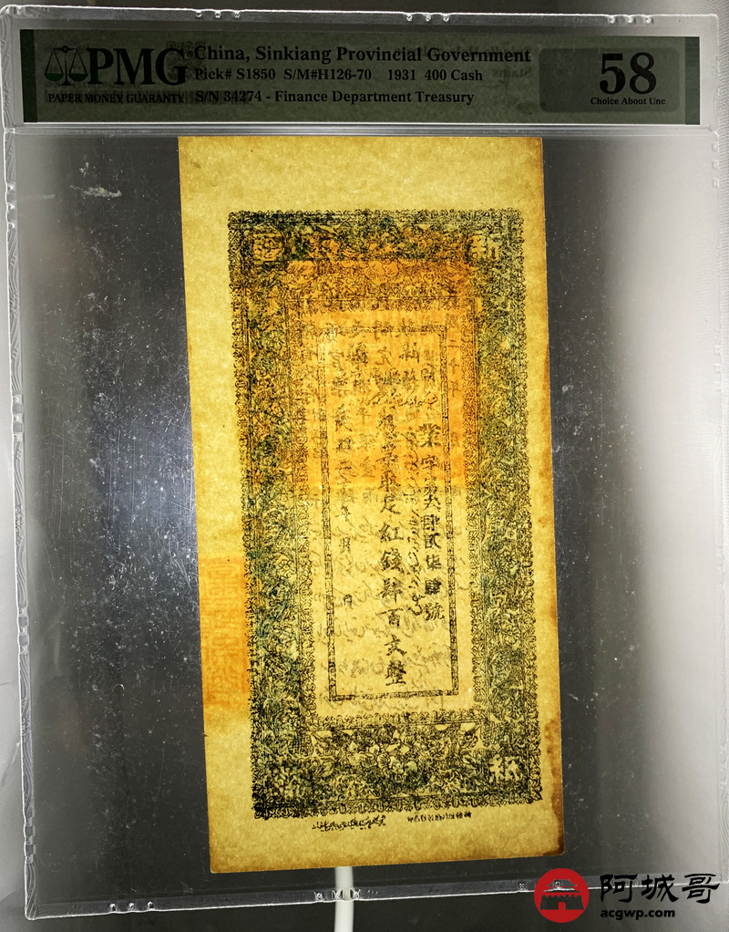Lot:30 民国20年 新疆财政厅库官票 红钱肆佰文整 PMG 58