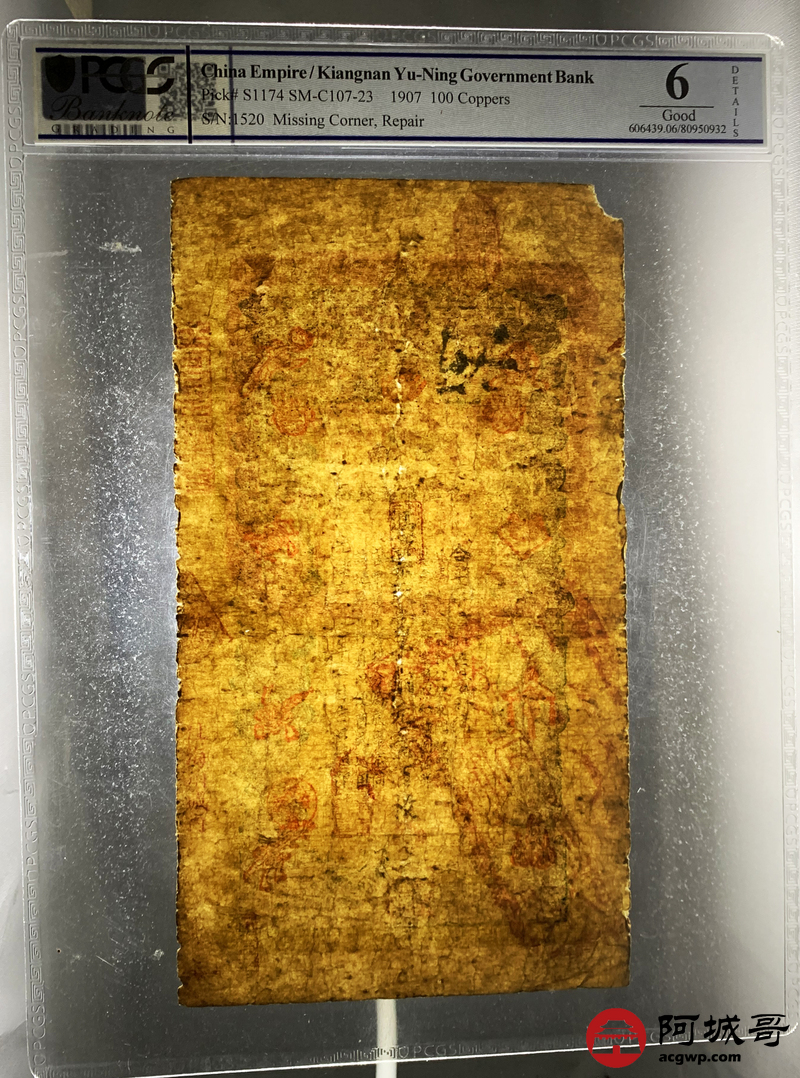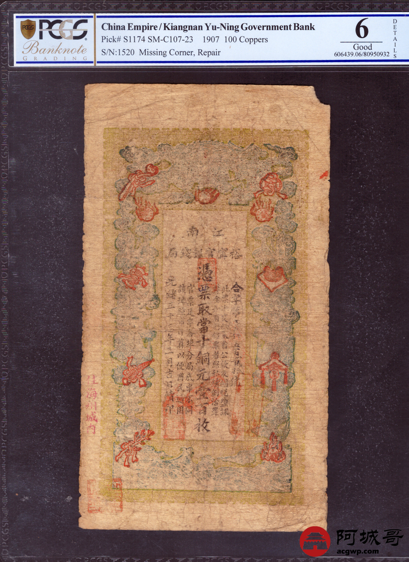Lot:54 江南裕宁官银钱局 当十铜元壹佰枚 光绪33年 住海州城内 PCGS 6