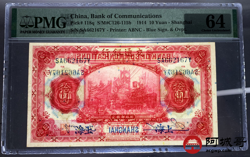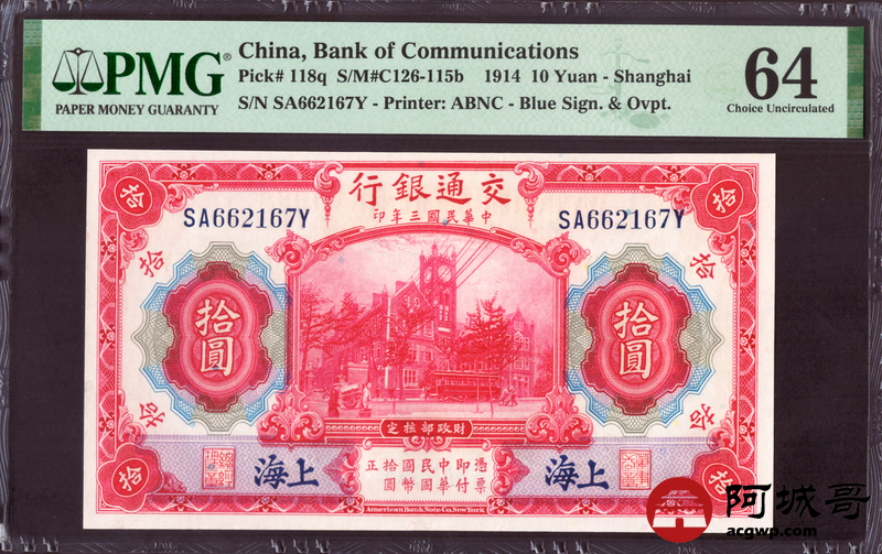 Lot:67 民国三年 交通银行 拾圆 PMG 64 早期稀少冠SA