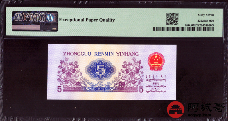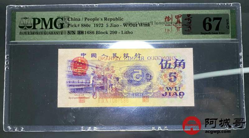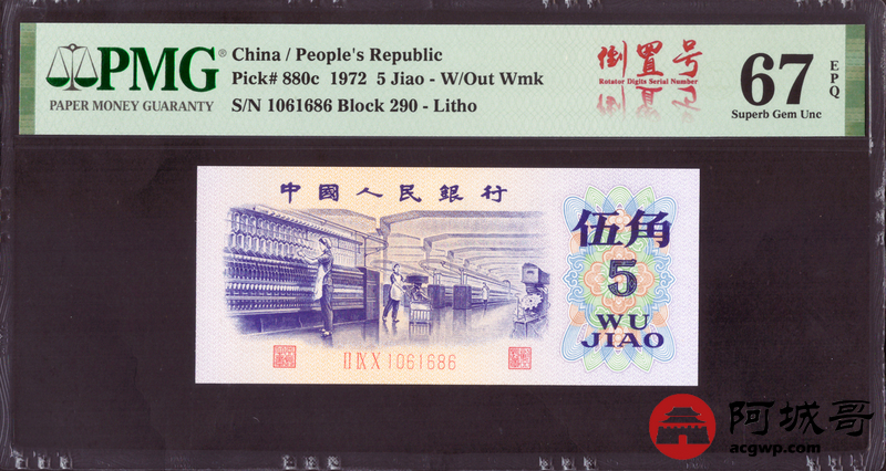 Lot:15 三版 1972年 纺织工人 平版伍角 PMG 67EPQ 倒置号