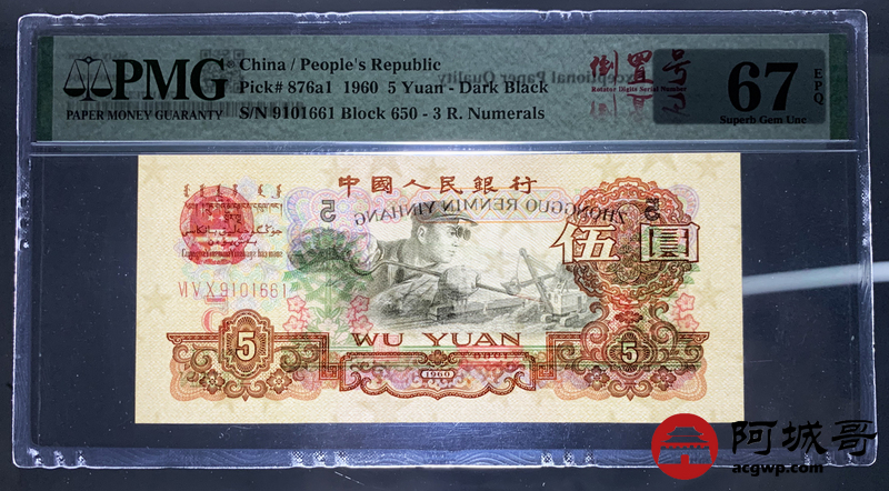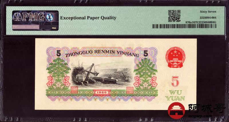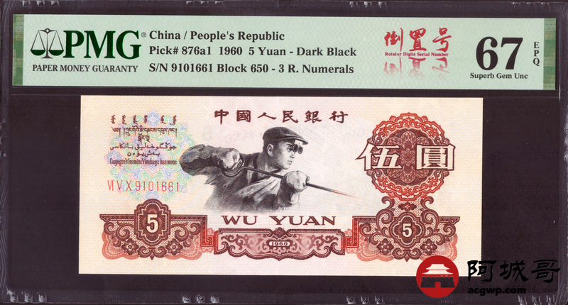Lot:6 三版 1960 炼钢工人5元 DRAKBLACK版 PMG 67EPQ 倒置号