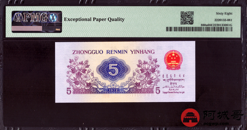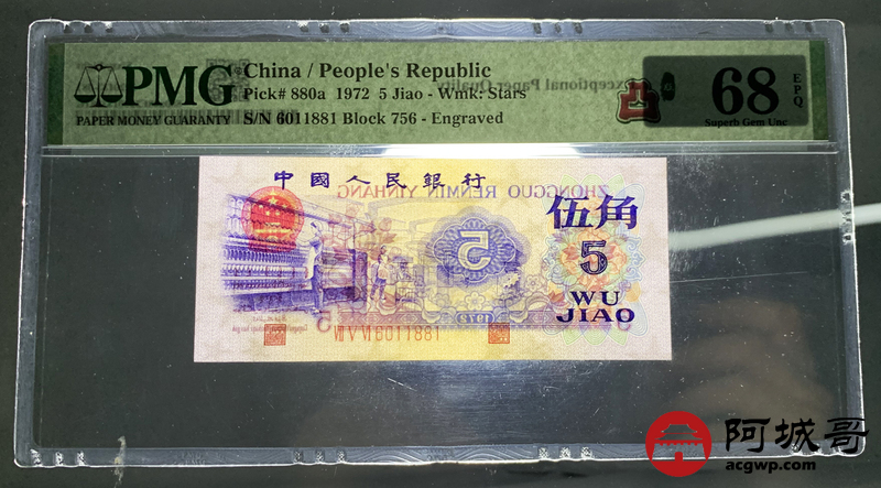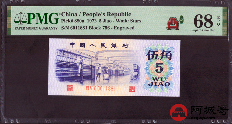 Lot:8 三版 1972年 纺织工人 凸版伍角 PMG 68EPQ 倒置号