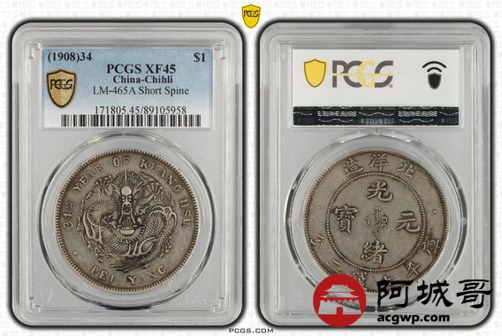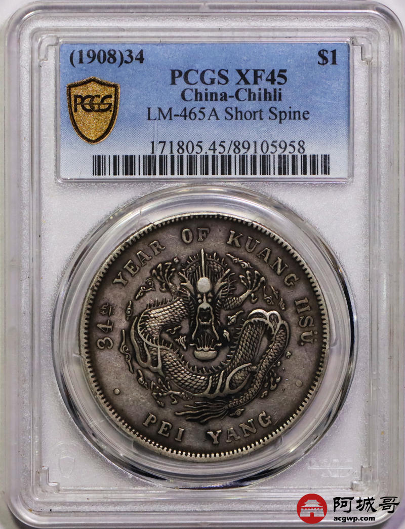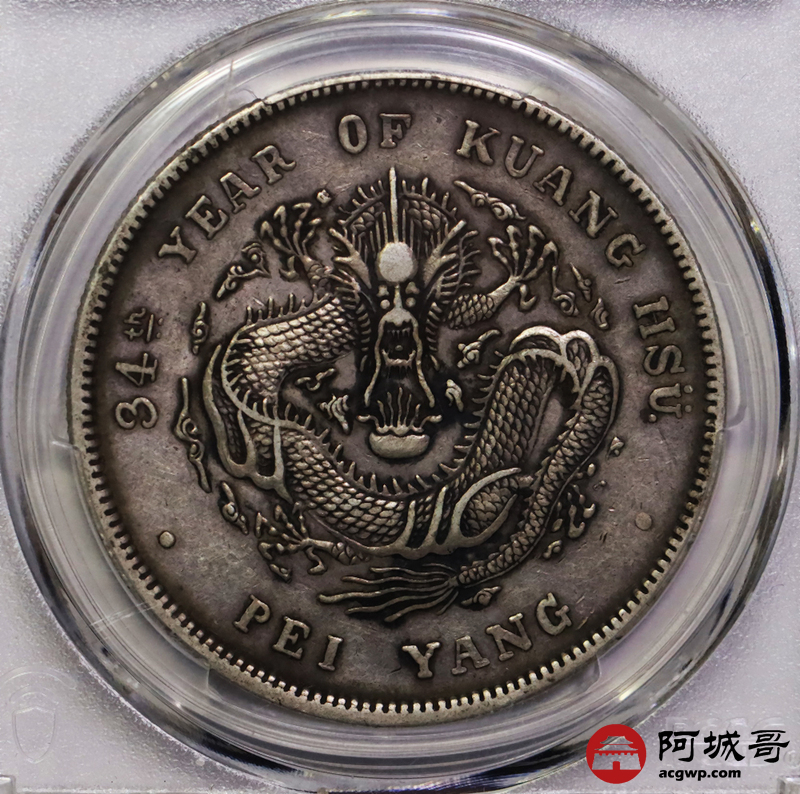 Lot:14 深打老包浆 北洋34七钱二分 短尾龙 PCGS XF45
