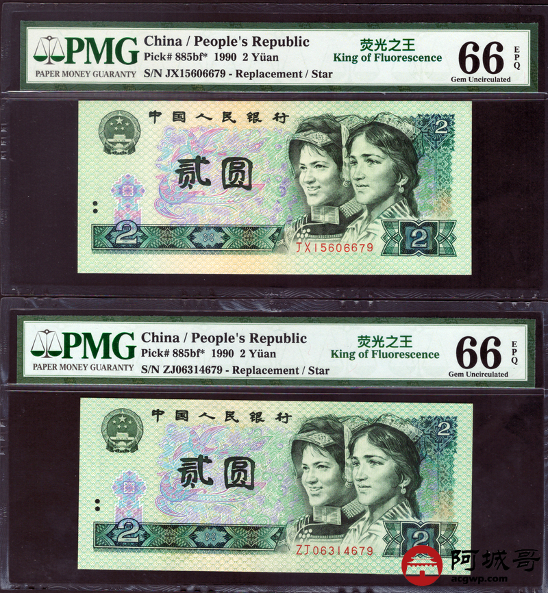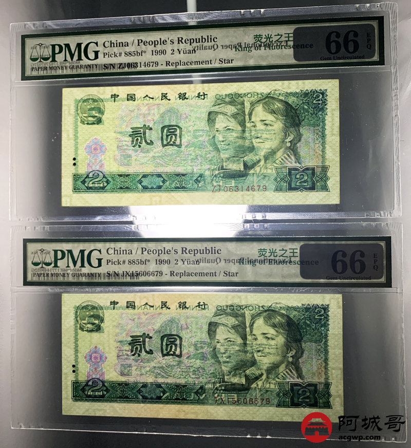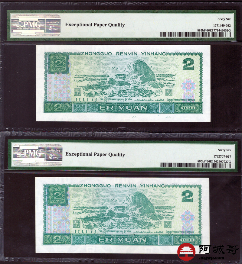 Lot:22 四版 1990年 2元 绿幽灵补号券 尾三同 PMG 66EPQ