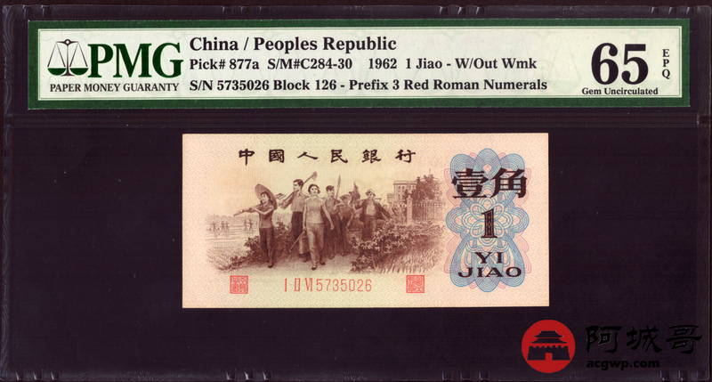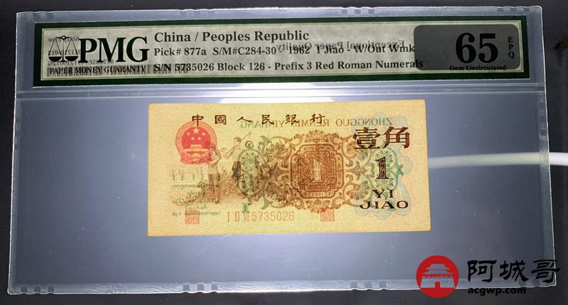 Lot:9 三版 1962年 三版珍品背绿壹角 PMG 65EPQ 好号无4