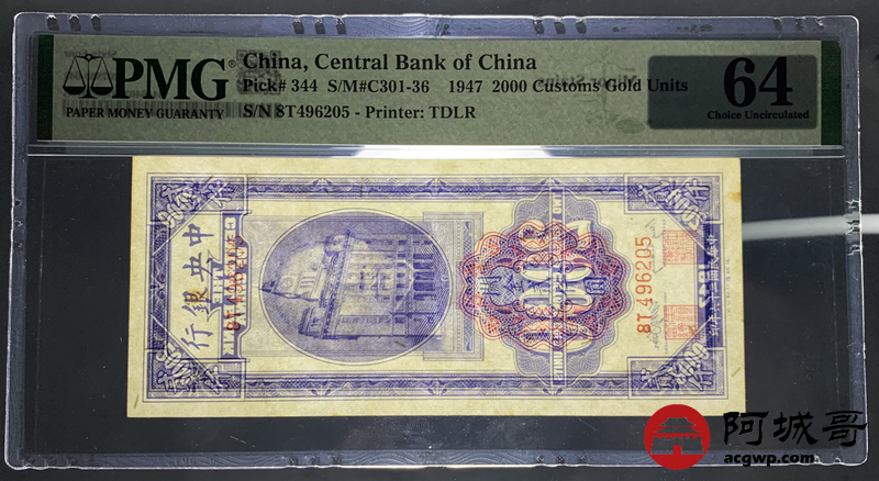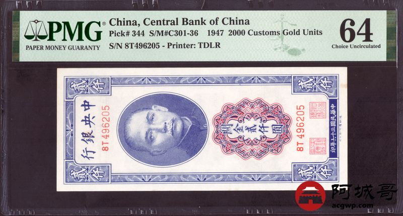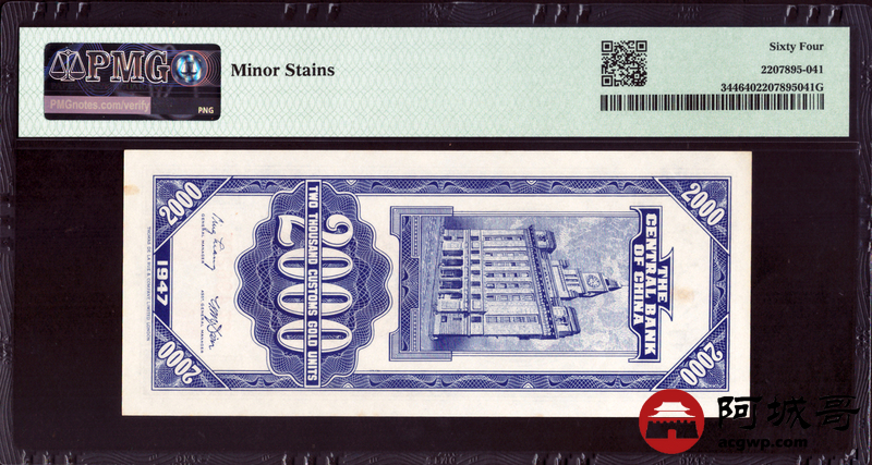 Lot:27 民国三十六年 中央银行 关金贰仟圆 PMG 64