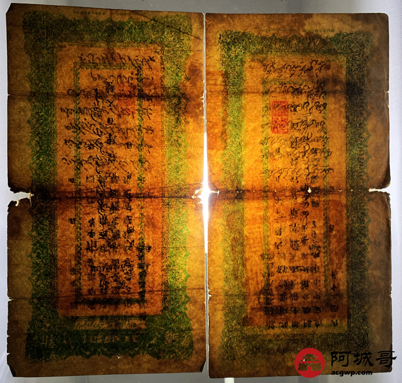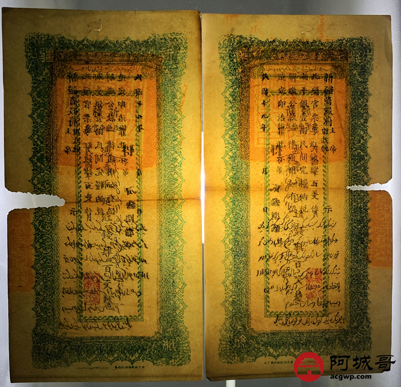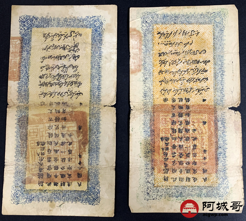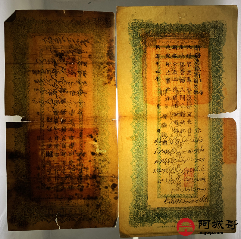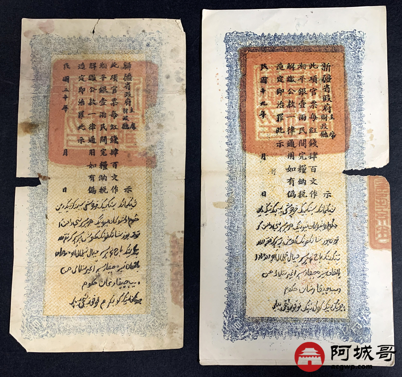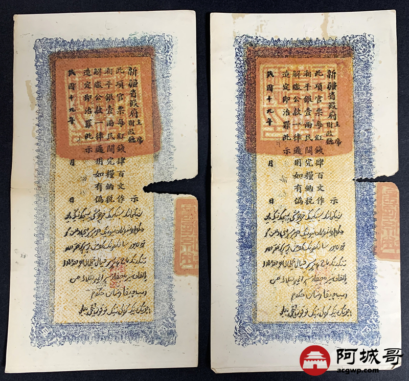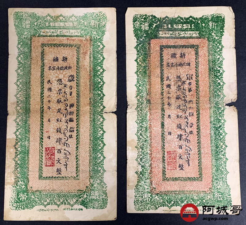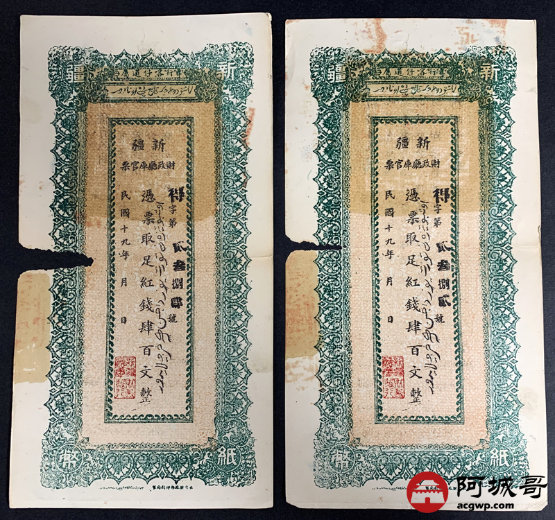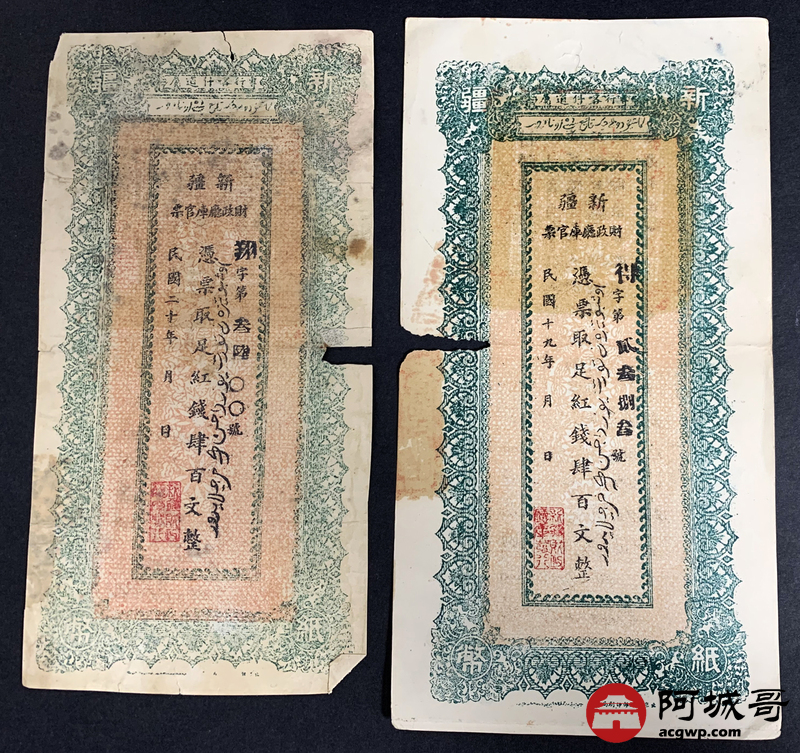 Lot:51 民国十九年、二十年 新疆财政厅库官票 红钱肆佰文整 6张 板子硬 66成新