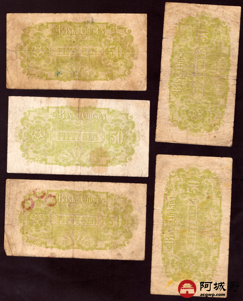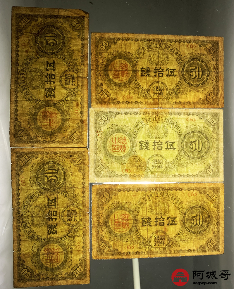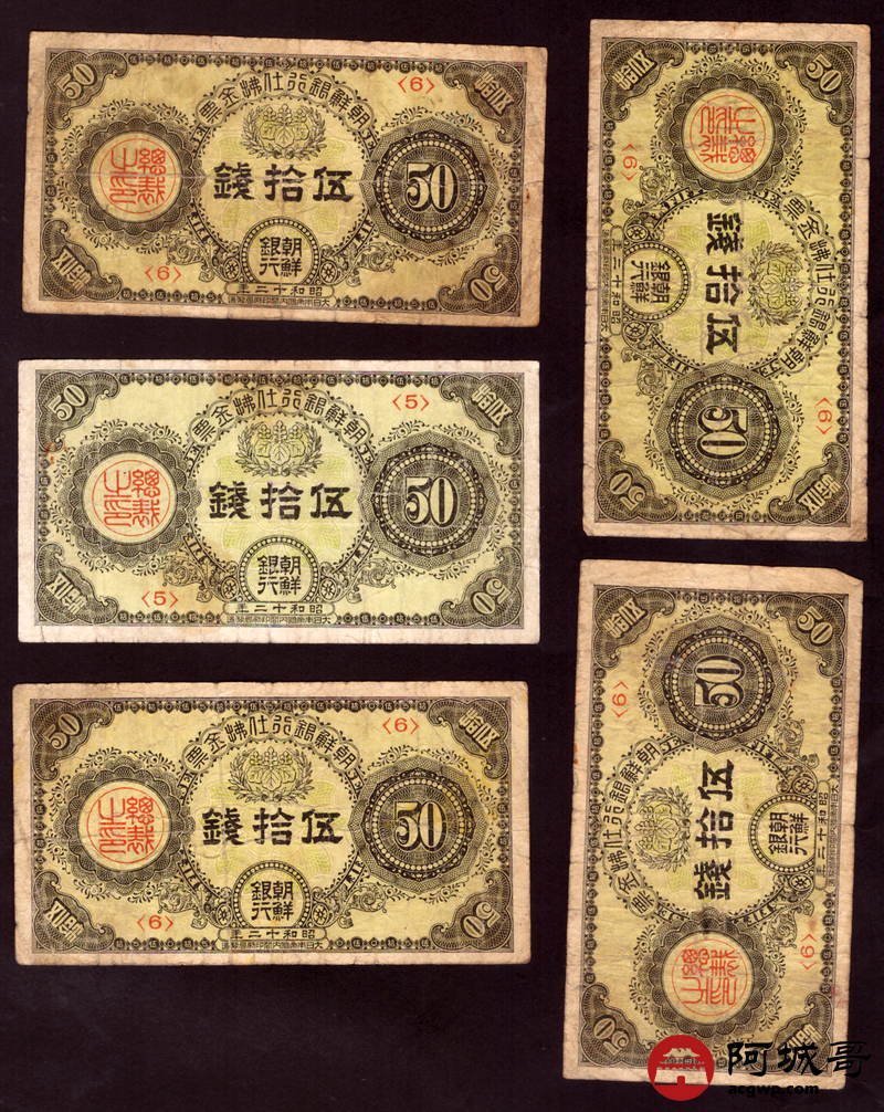 Lot:46 朝鲜银行仕拂金票 伍拾钱 5张 69至7成新