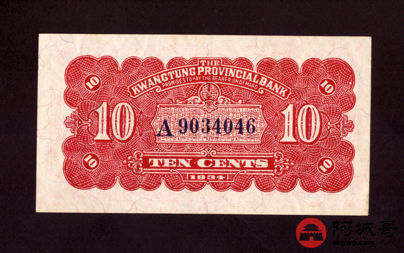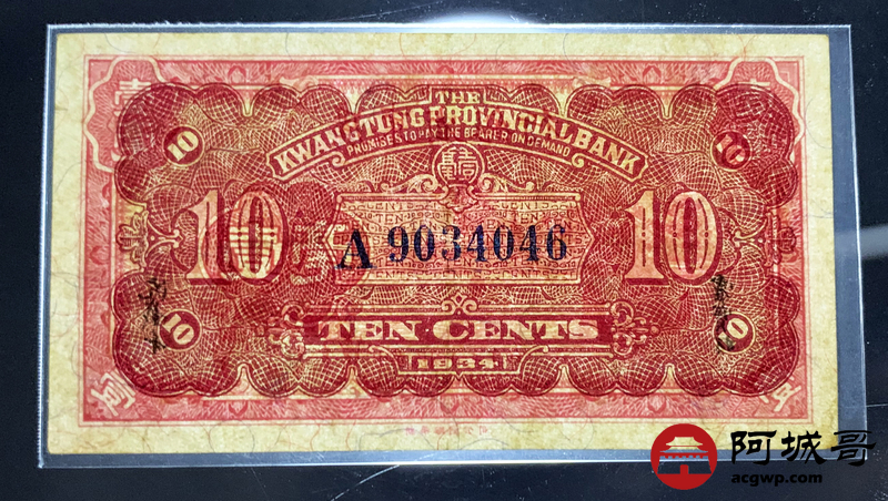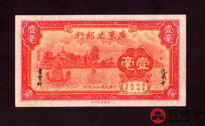 Lot:45 民国23年 广东省银行 壹毫 原票85成新