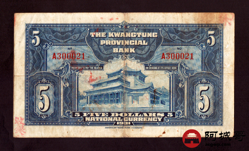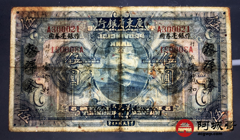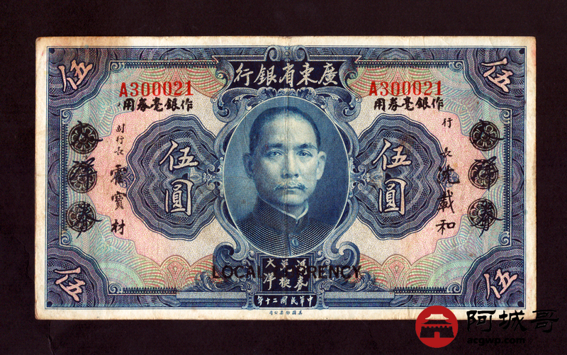 Lot:29 民国20年 广东省银行 伍圆 约7成新