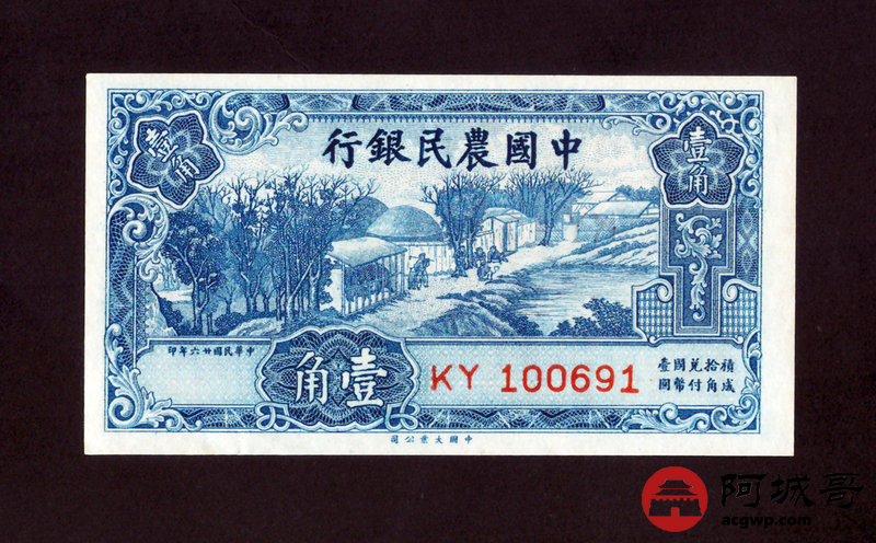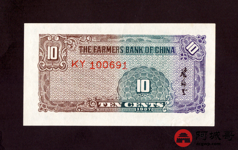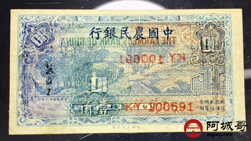 Lot:54 民国二十六年 中国农民银行 壹角 原票约9成新 倒置号