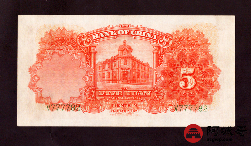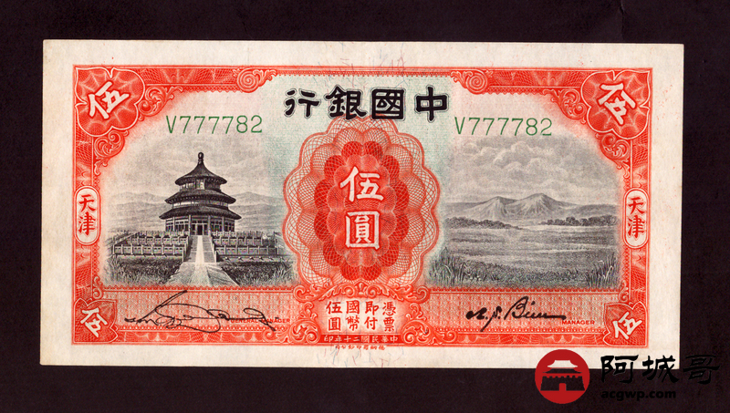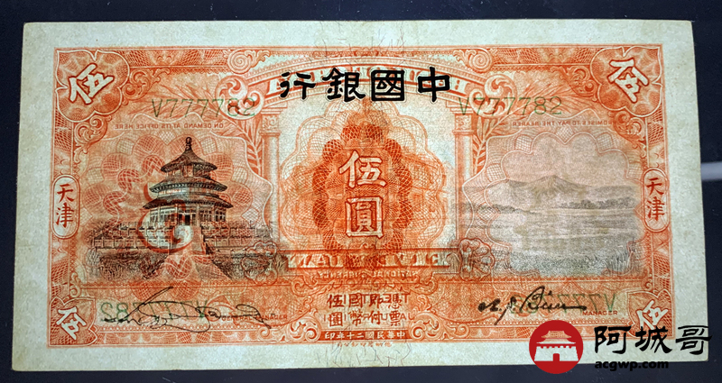Lot:58 民国20年 中国银行 伍圆 天津地名 88至9成新