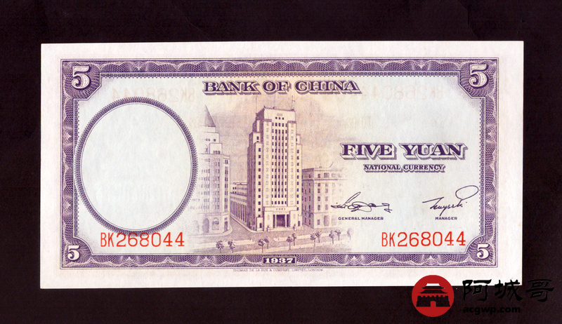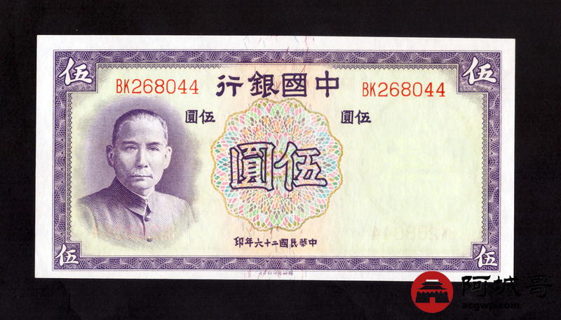 Lot:33 民国26年 中国银行 伍圆 原票97至全新
