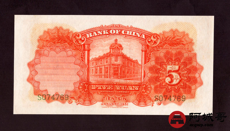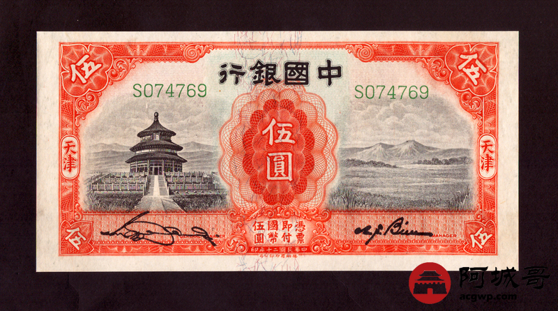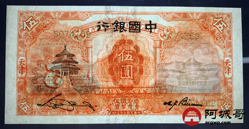 Lot:11 民国20年 中国银行 伍圆 天津地名 细小揭薄 9成新