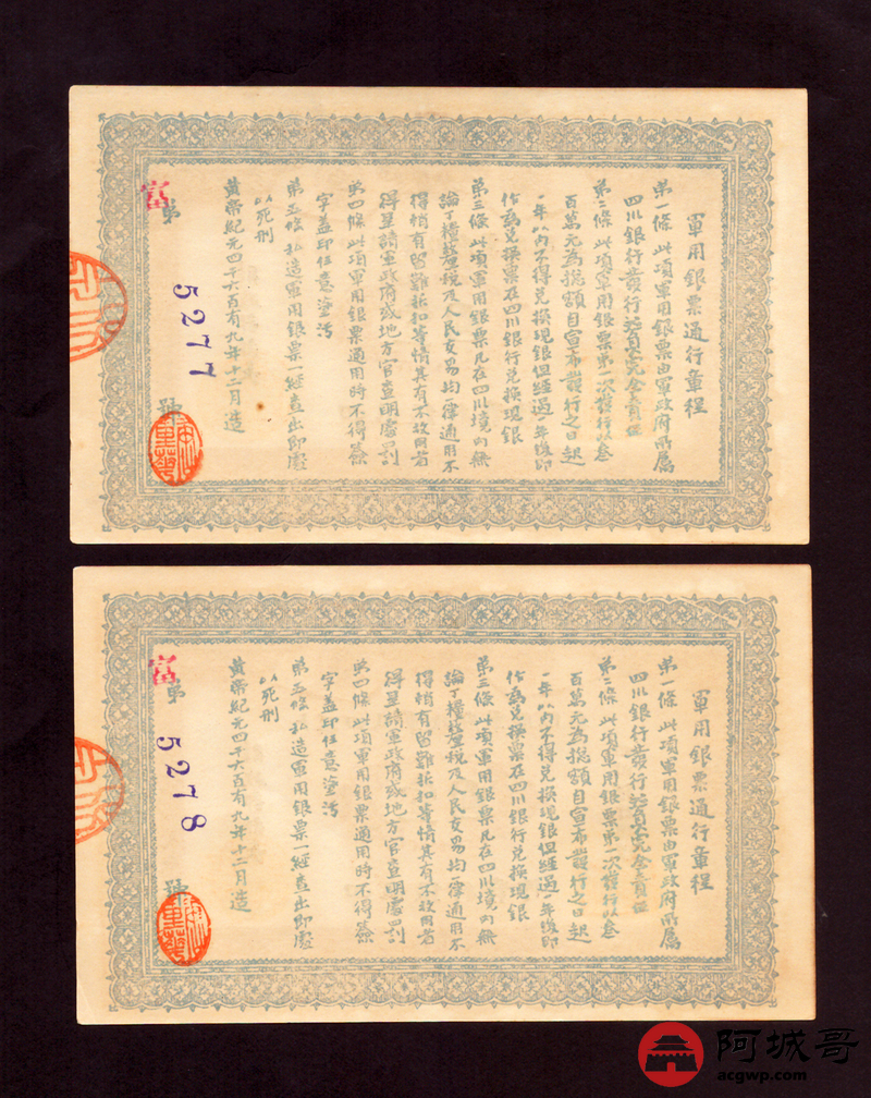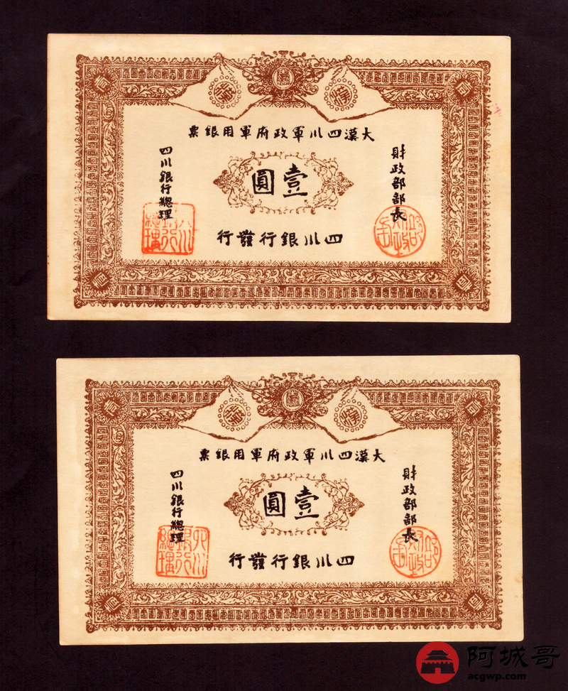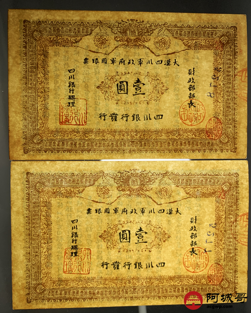 Lot:44 大漠四川军政府军用银票 壹圆 同期老假票 2张 92成新