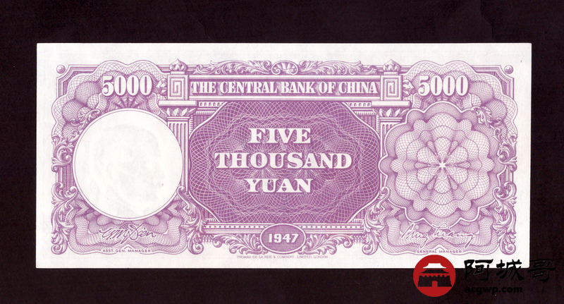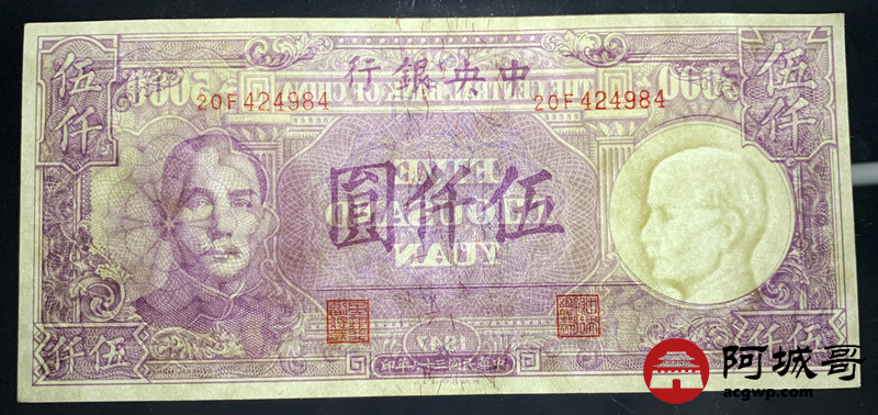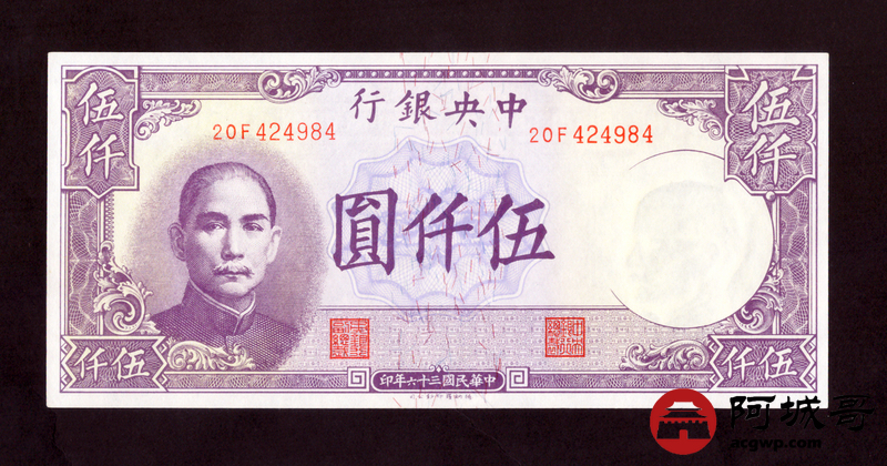 Lot:42 民国36年 中央银行 伍仟圆 95成新