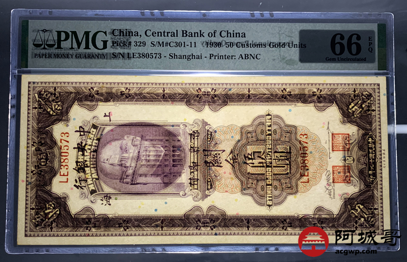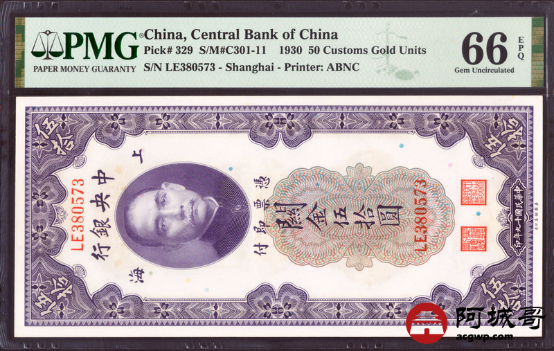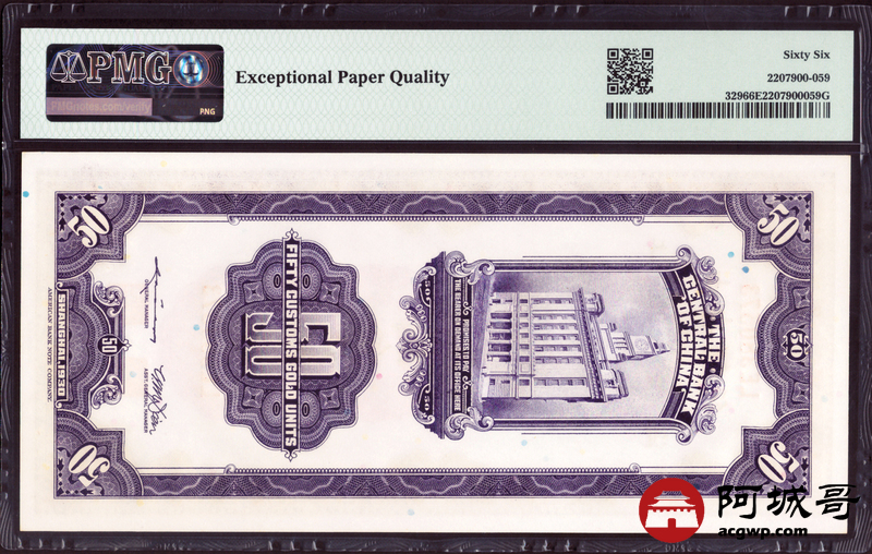 Lot:24 民国19年 中央银行 关金伍拾圆 PMG 66EPQ