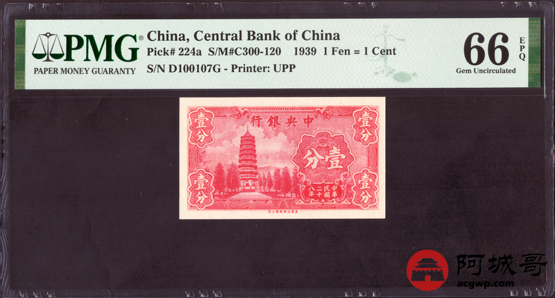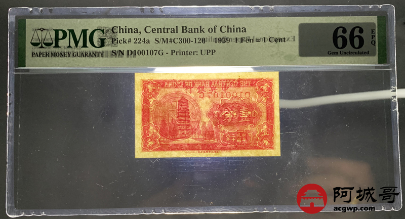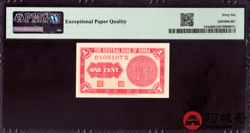 Lot:37 民国28年 中央银行 壹分 PMG 66EPQ