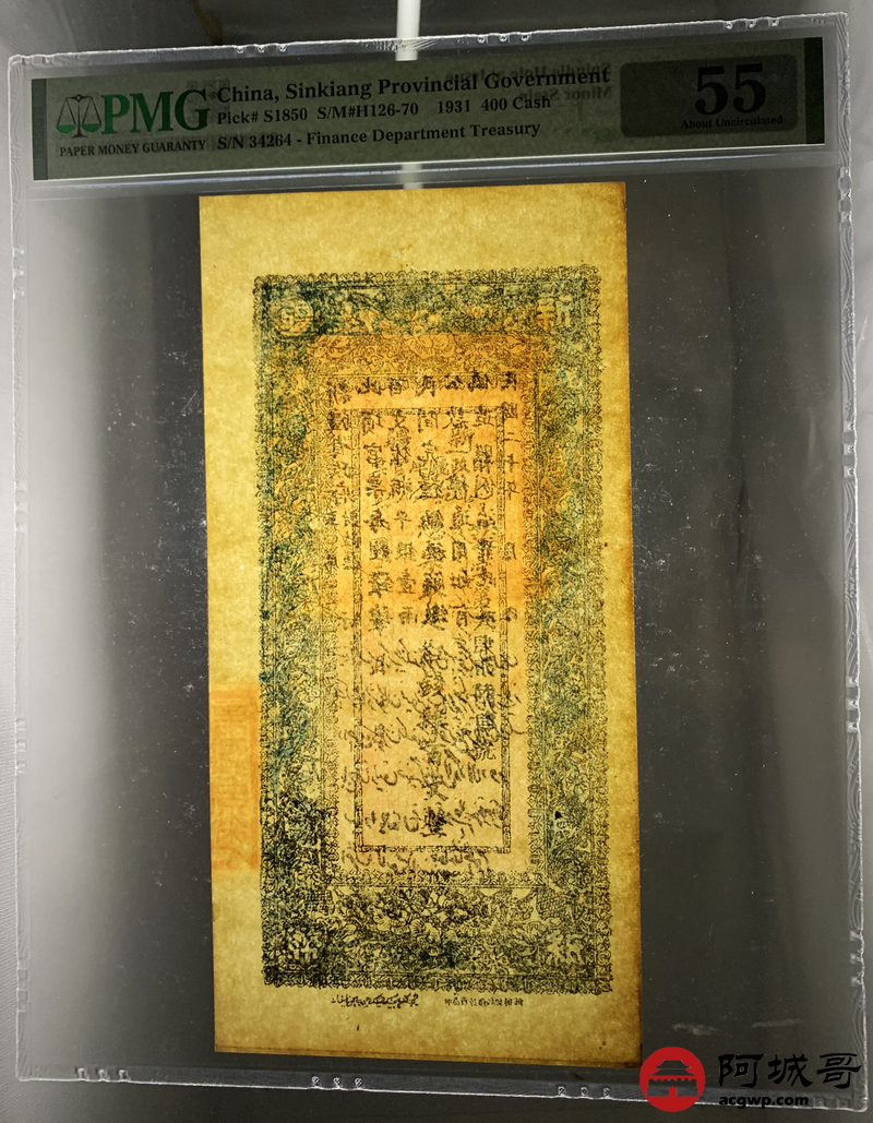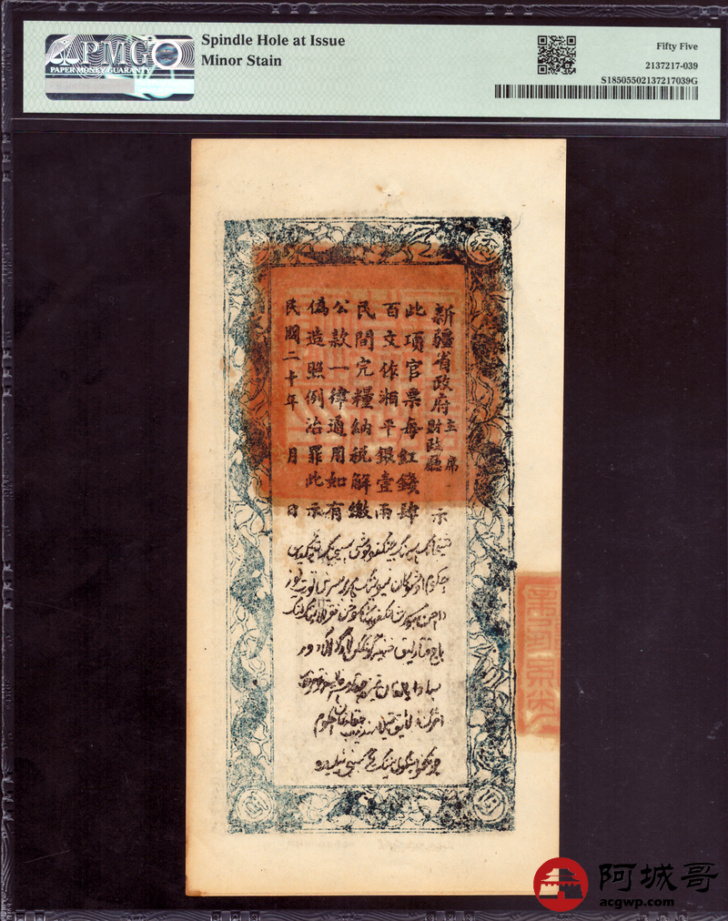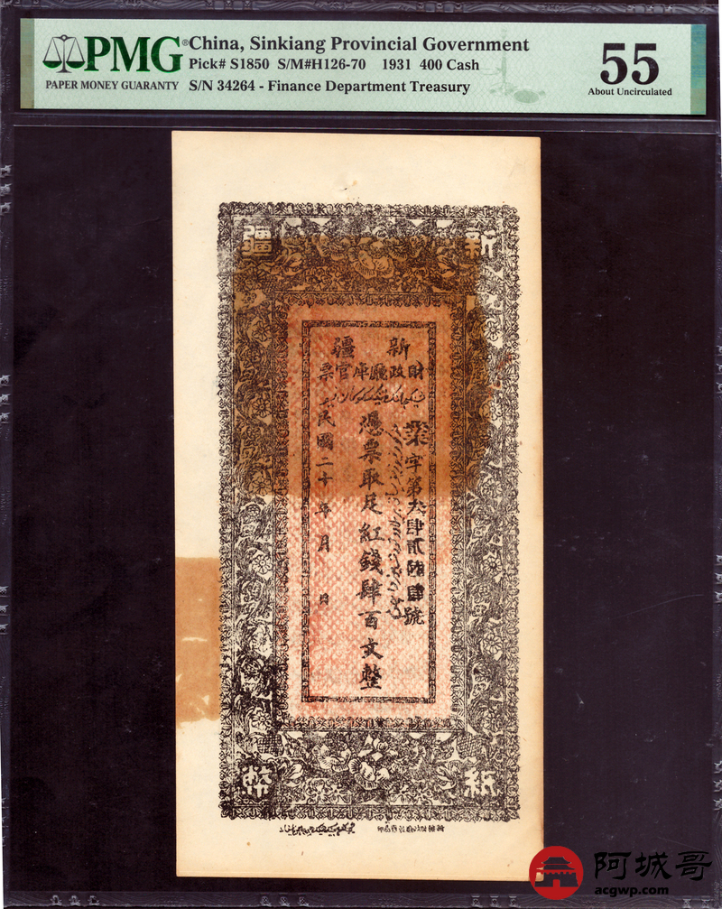 Lot:33 民国二十年 新疆财政厅库官票 红钱肆佰文整 PMG 55