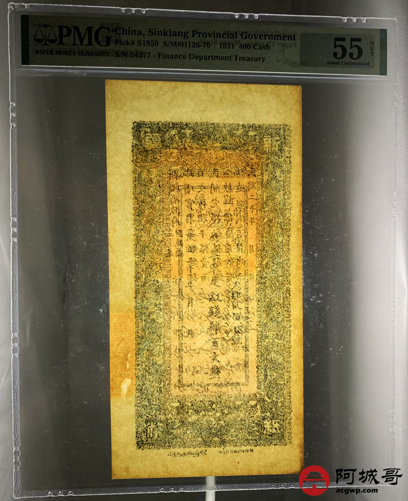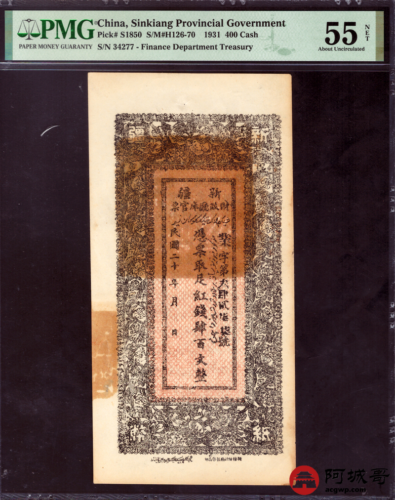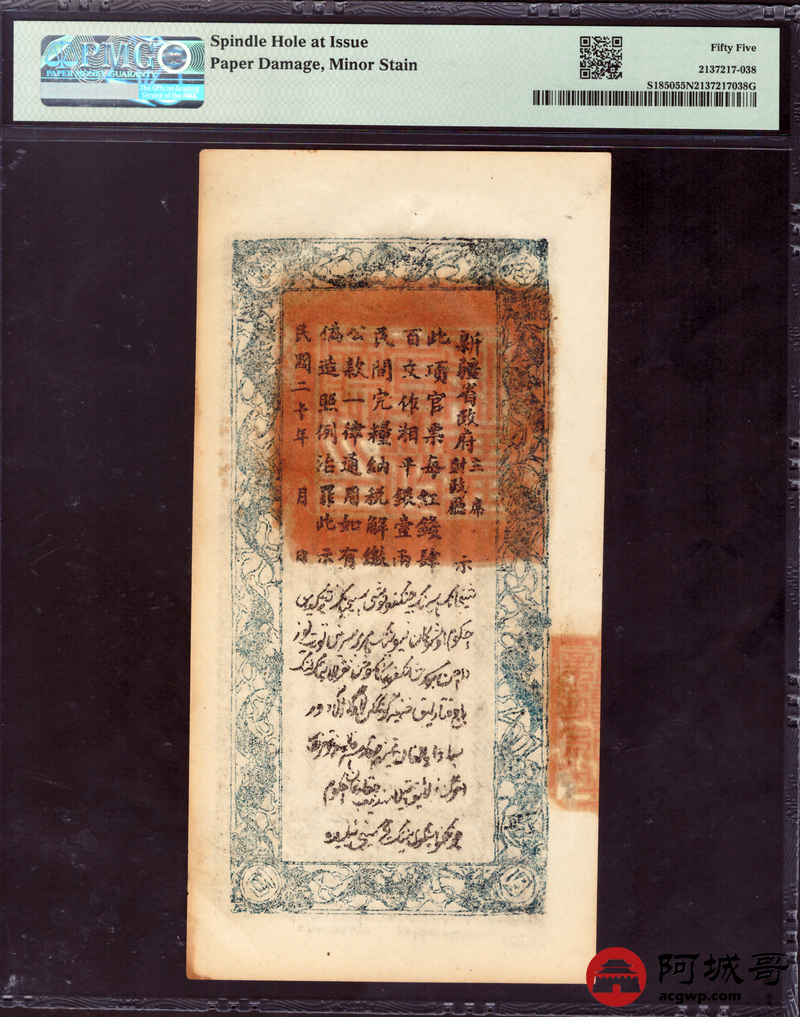 Lot:20 民国二十年 新疆财政厅库官票 红钱肆佰文整 PMG 55