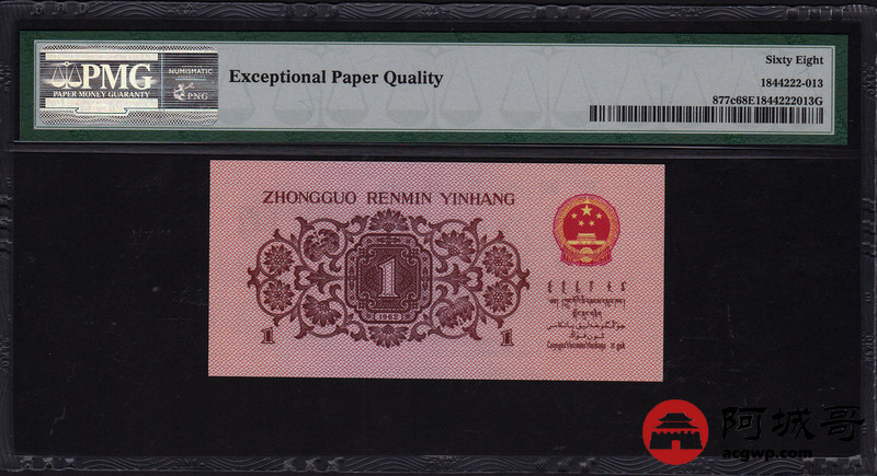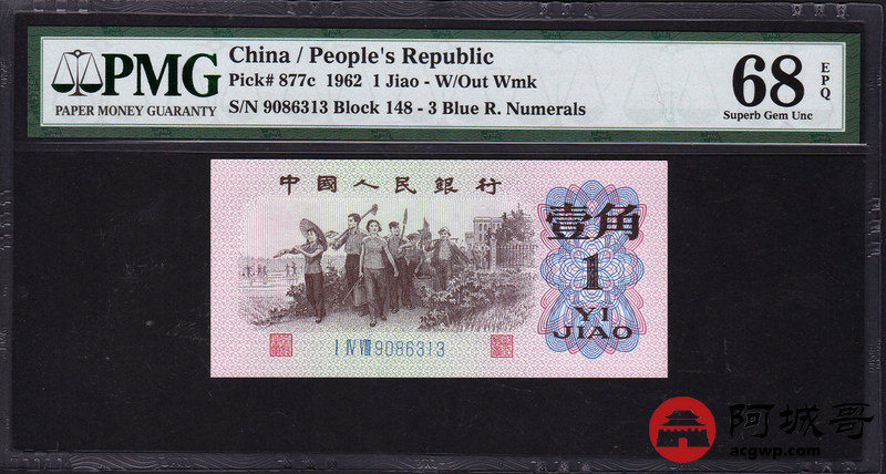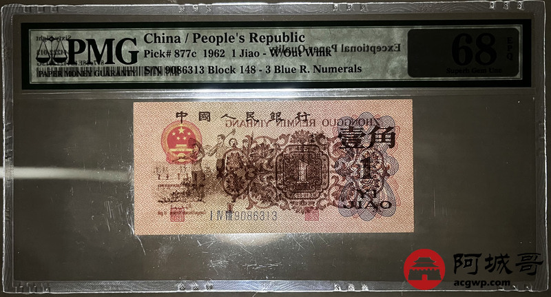 Lot:21 三版 1962年 壹角 蓝3冠 平版 好号全程无47 高分 PMG 68 EPQ