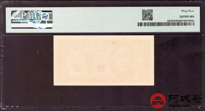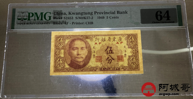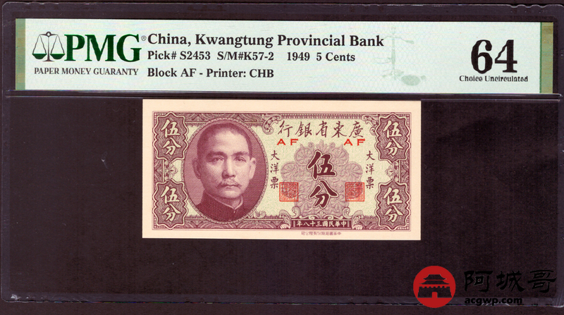 Lot:5 民国38年 广东省银行 伍分 PMG 64