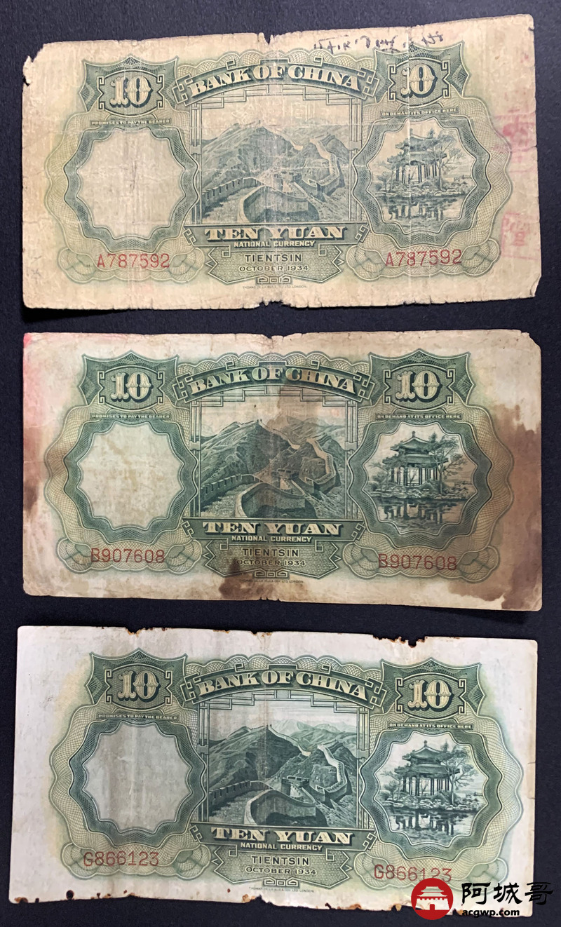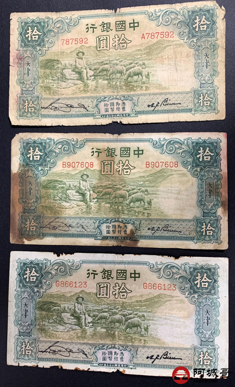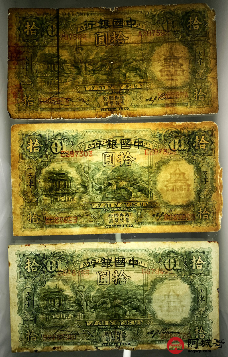 Lot:59 民国23年 中国银行拾元 5张 66至68成新