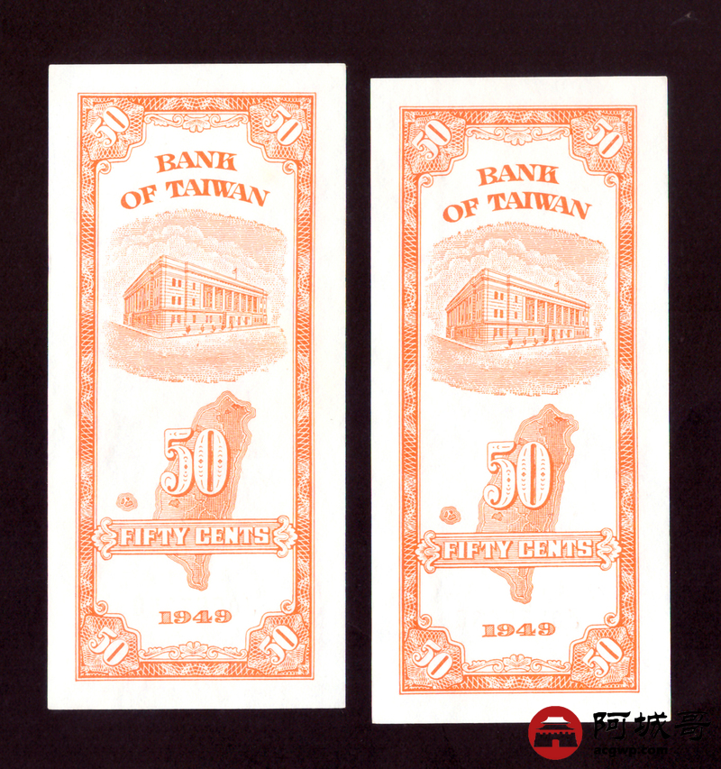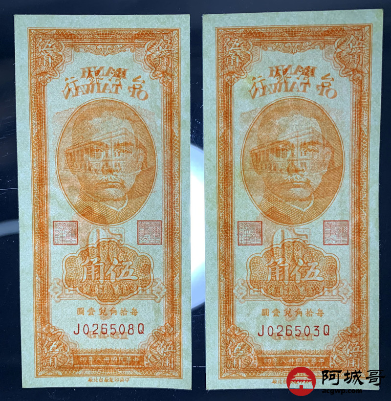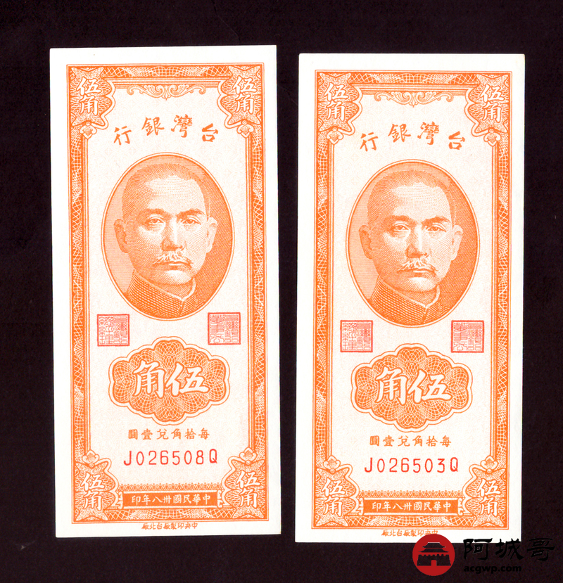 Lot:25 民国三十八年 台湾银行 伍角 2张 原票96至全新