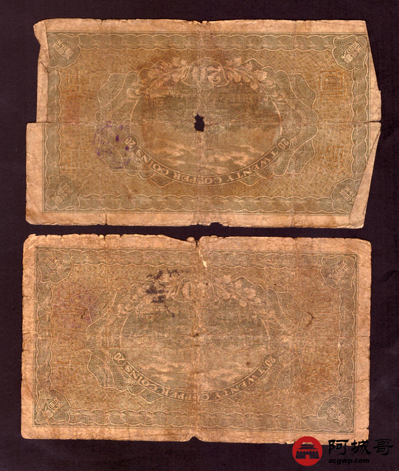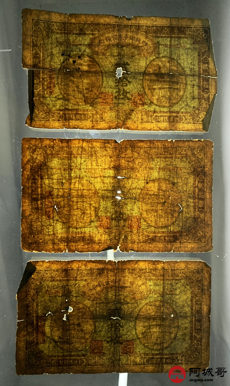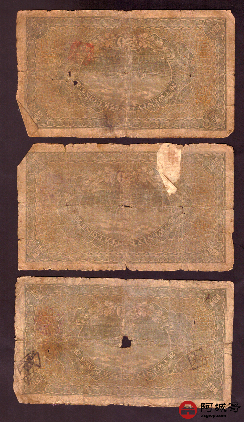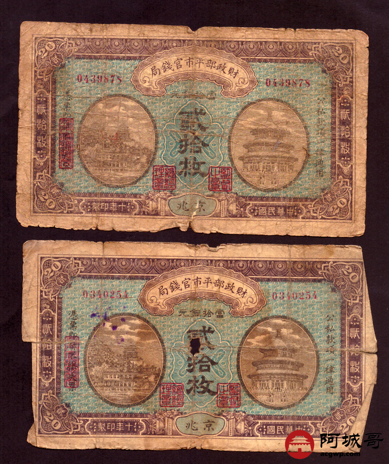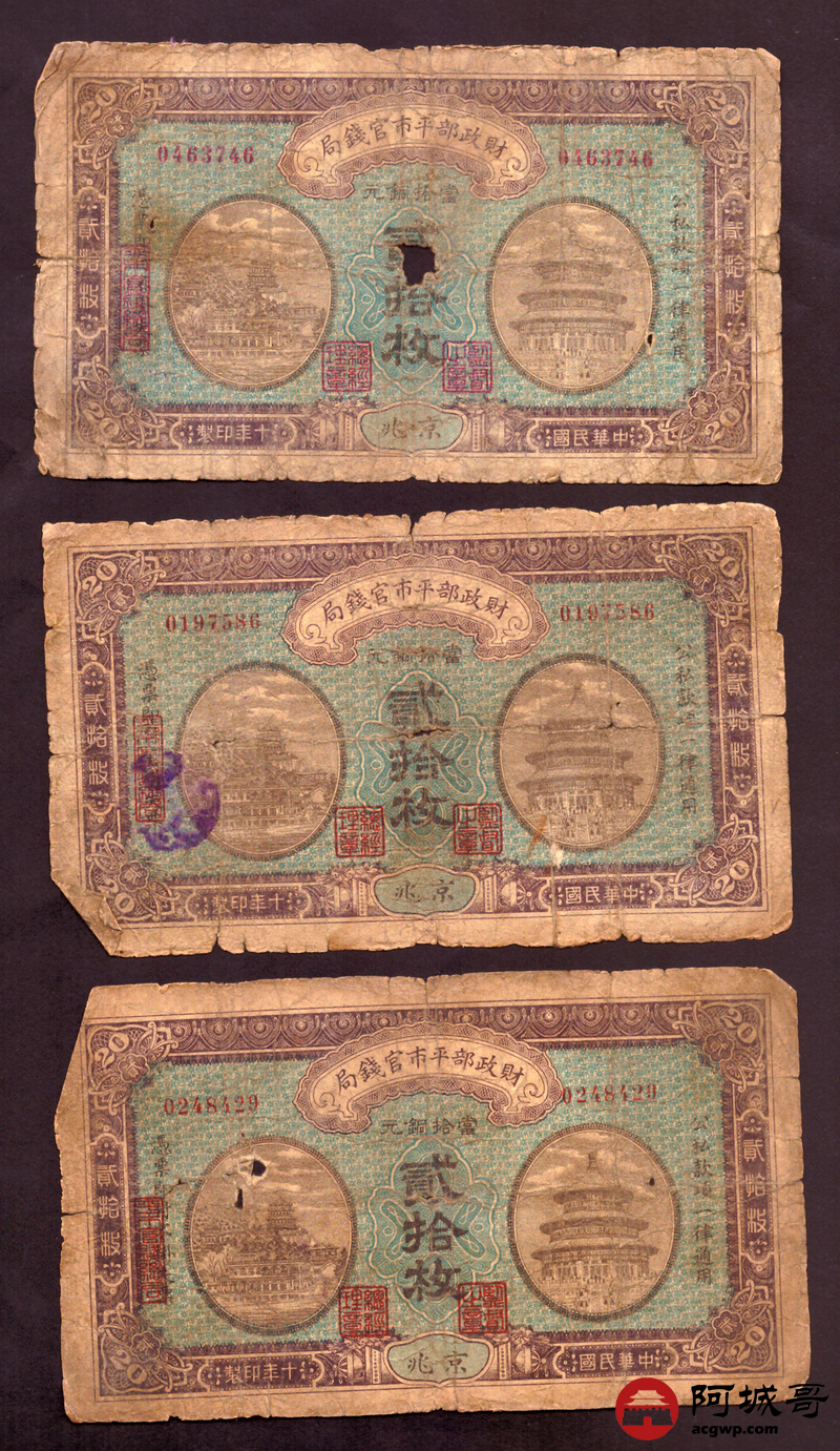 Lot:64 民国十年 财政部平市官钱局 贰拾枚 5张 56成新