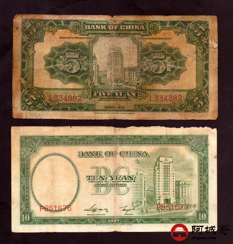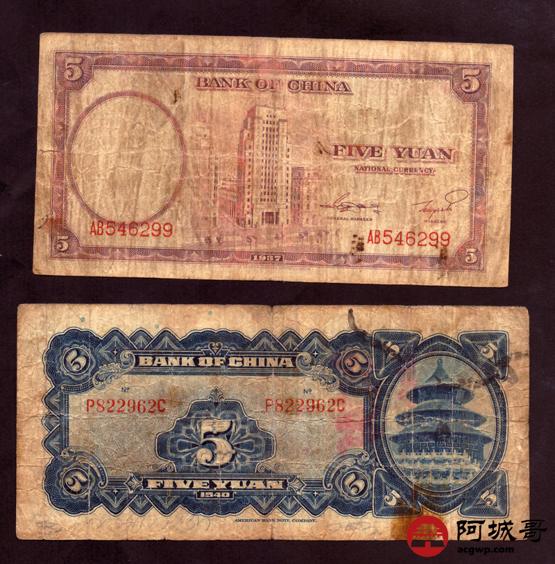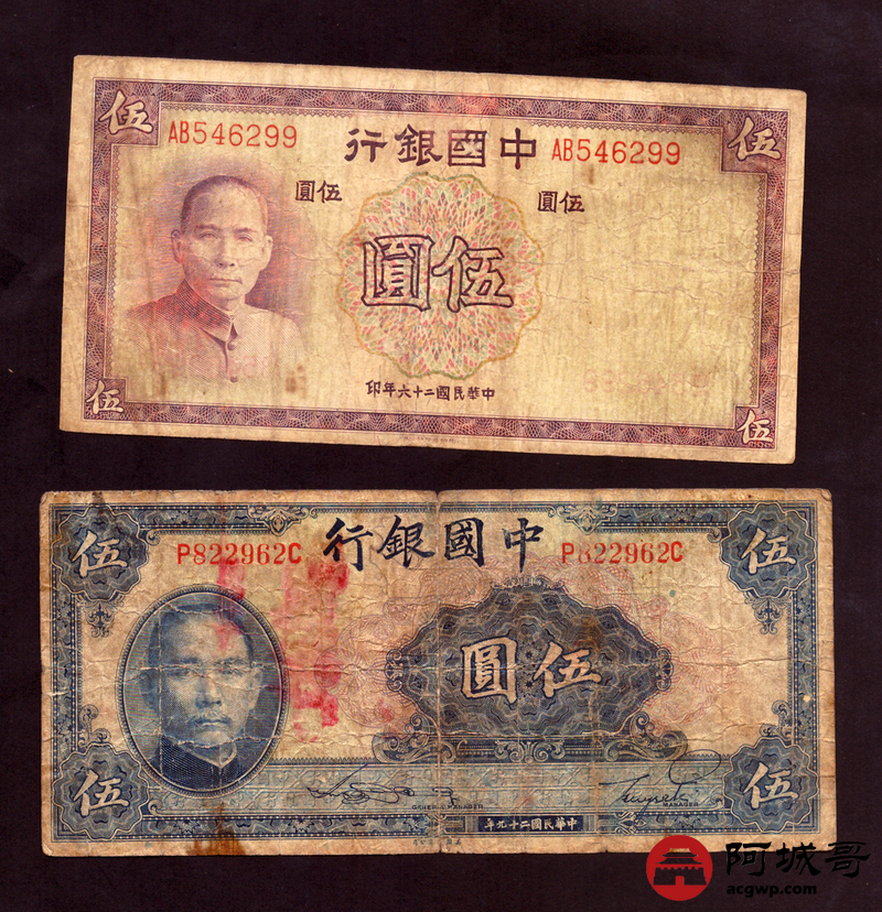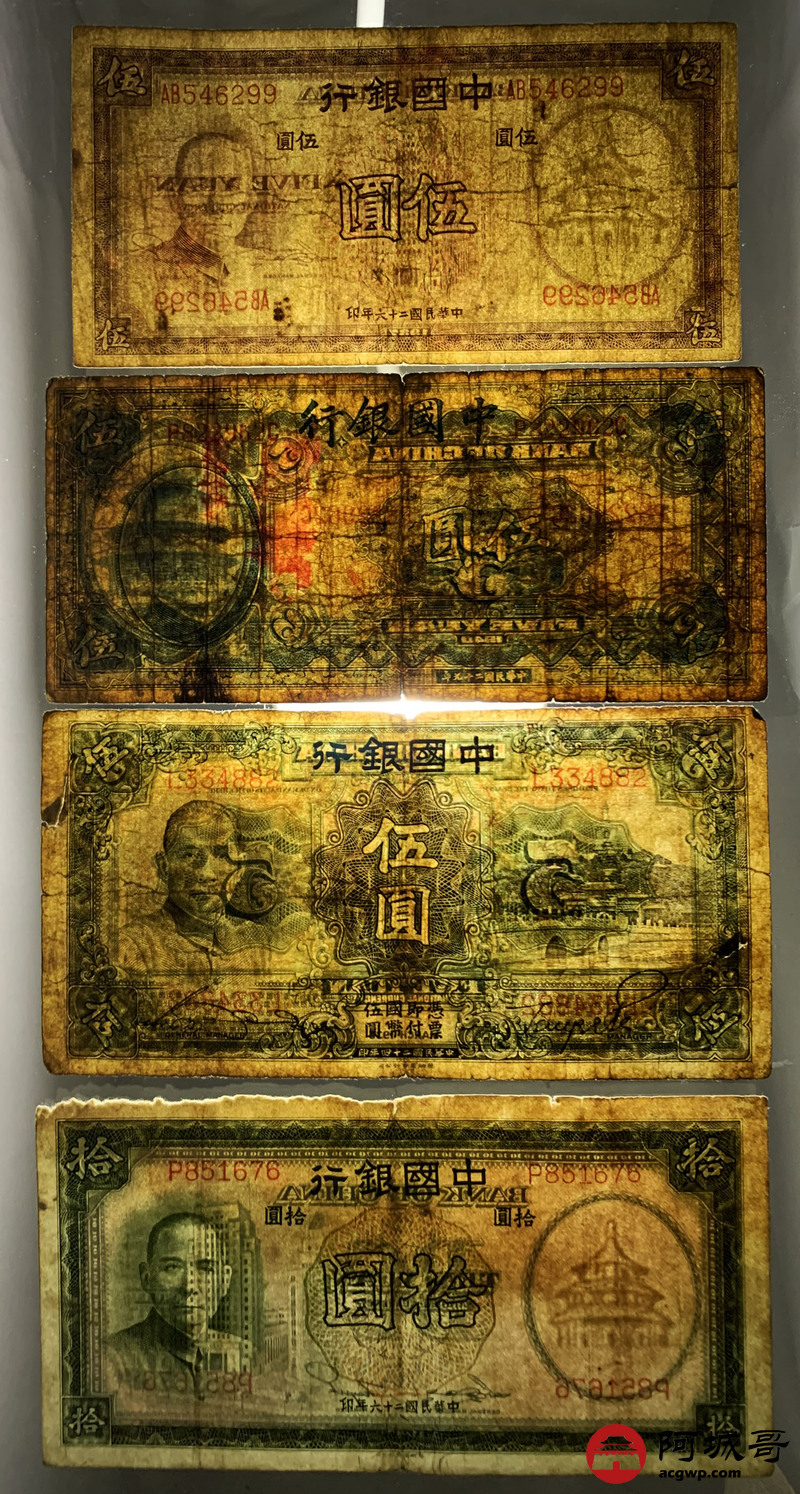 Lot:56 民国时期 中国银行 伍圆、拾圆 4张 一张修补 67至7成新
