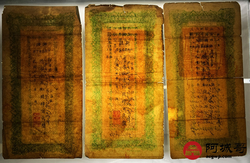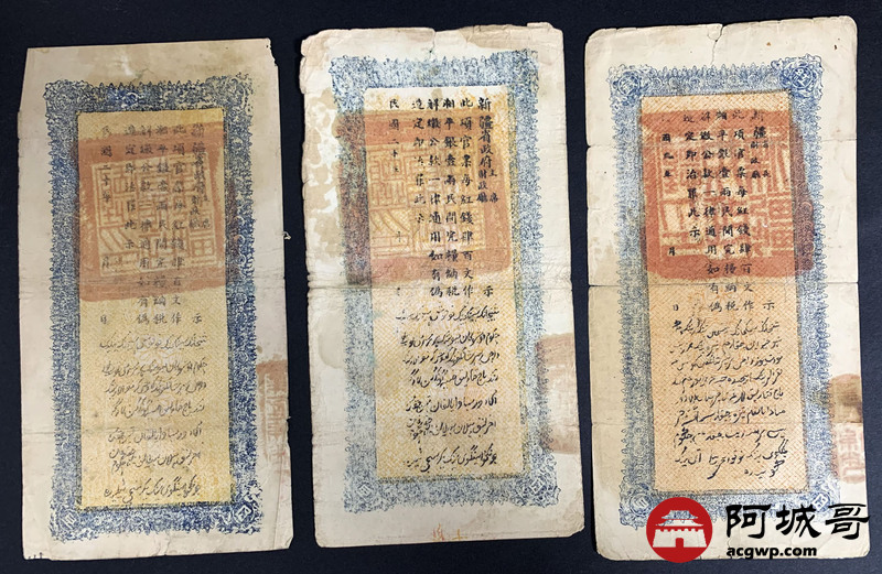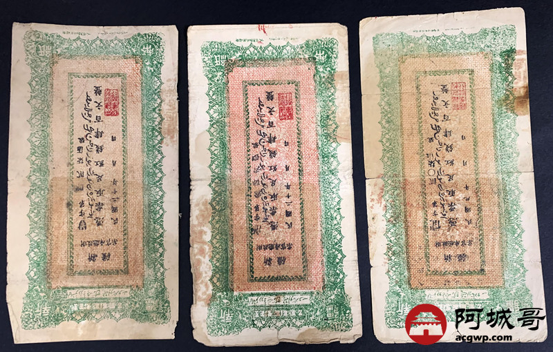 Lot:40 民国九年、二十年 新疆财政厅库官票 红钱肆佰文整 3张 67至69成新