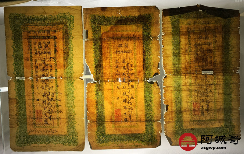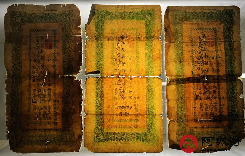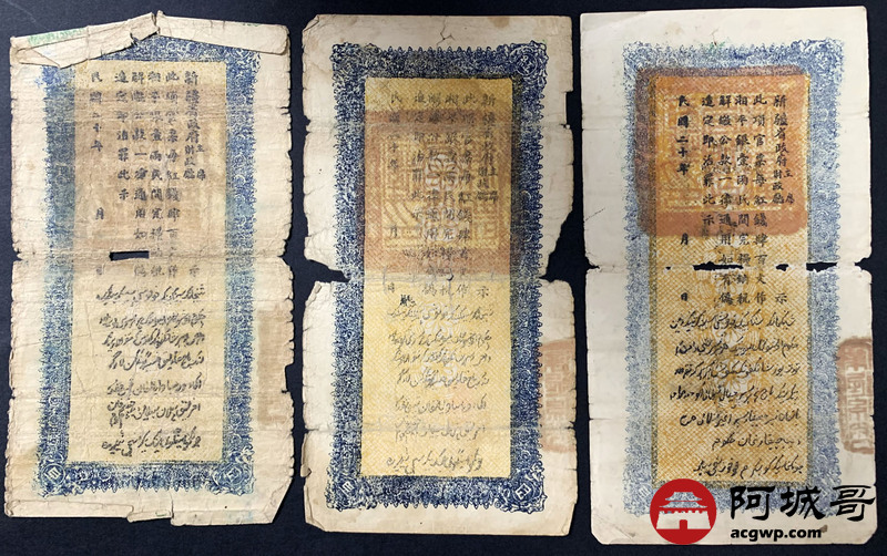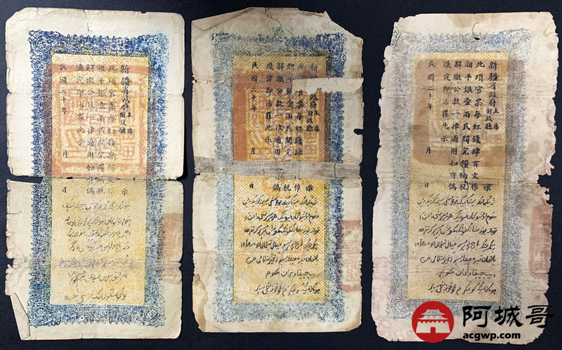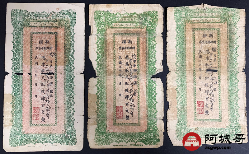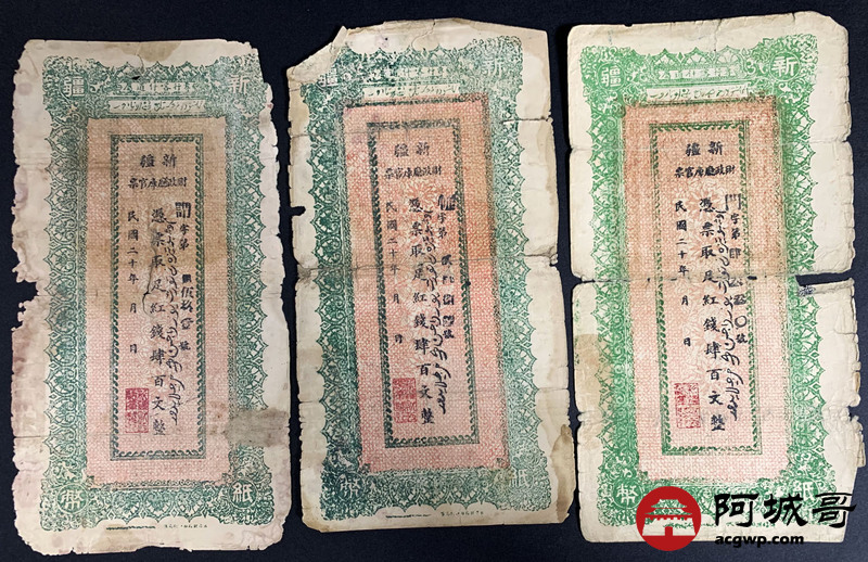 Lot:34 民国二十年 新疆财政厅库官票 红钱肆佰文整 6张 56至65成新 两张修补